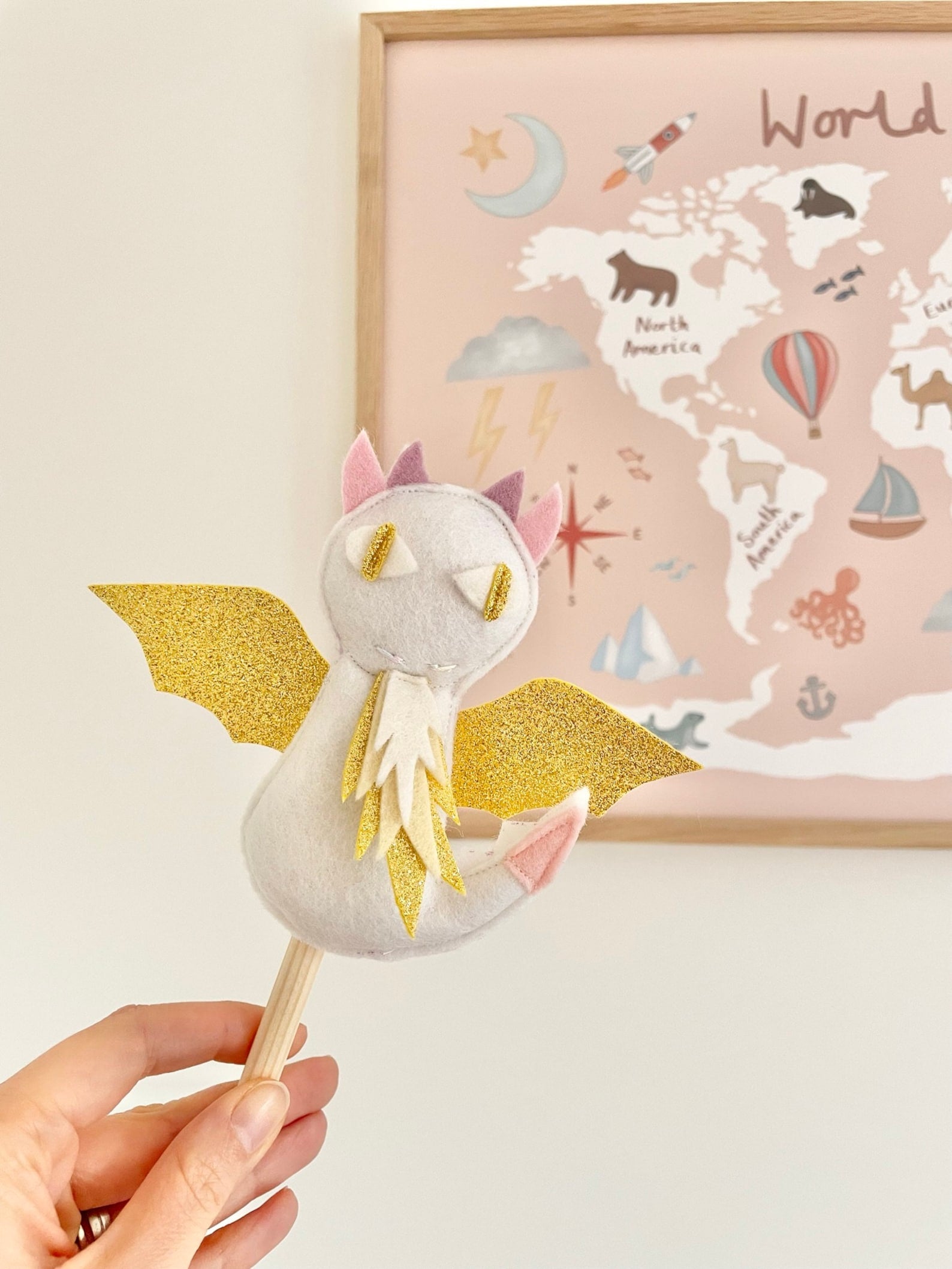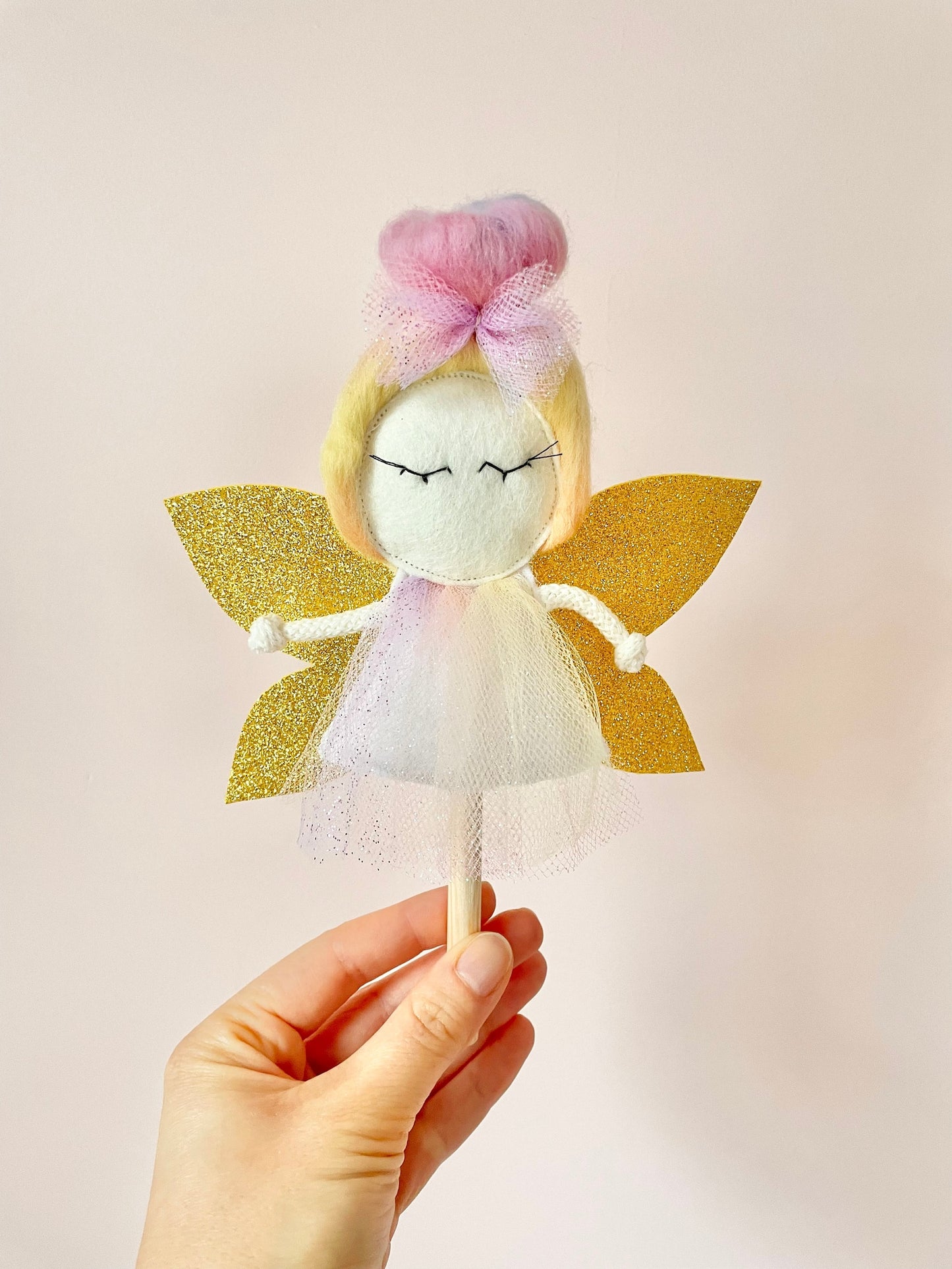 Materials: wool felt (EN 71-3 certified), pine wood, wool filling, threads OEKO tex certified, tulle, glitter felt