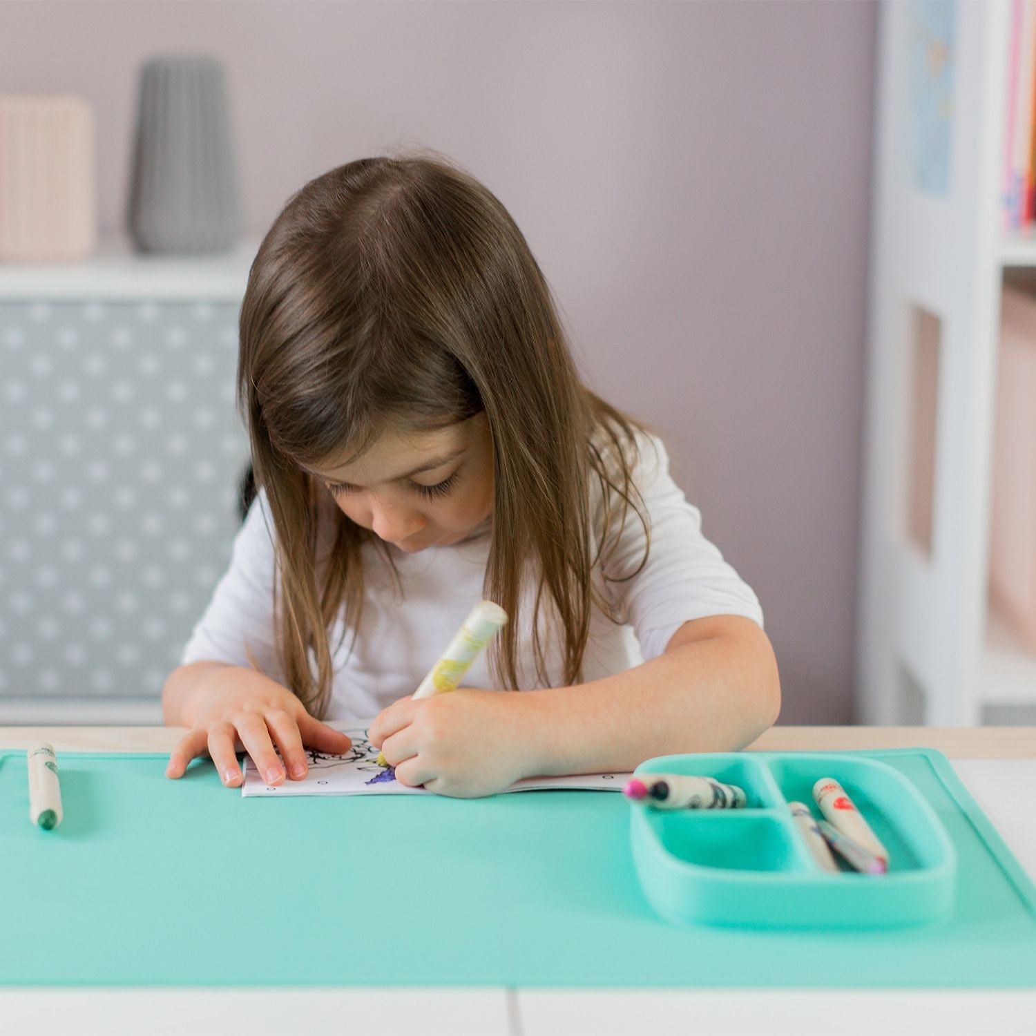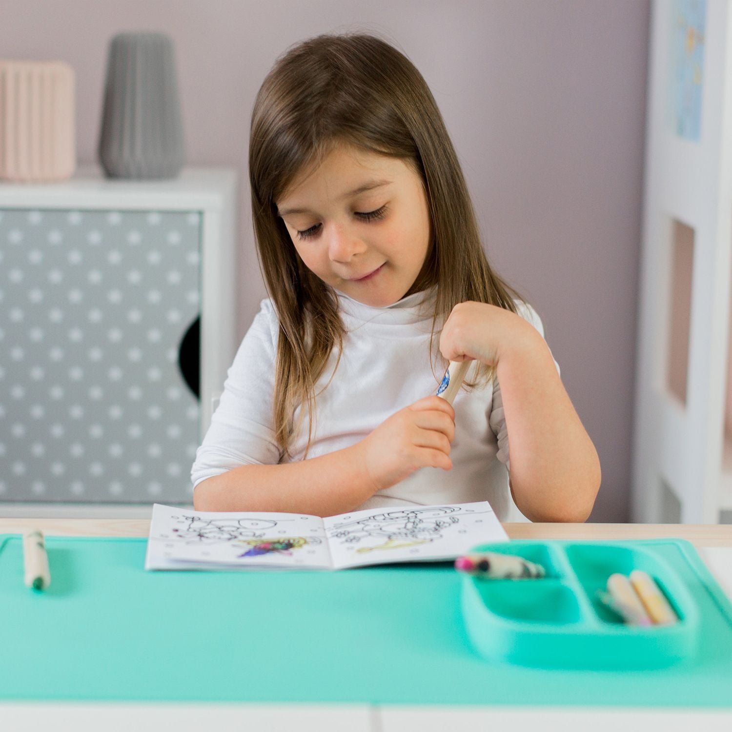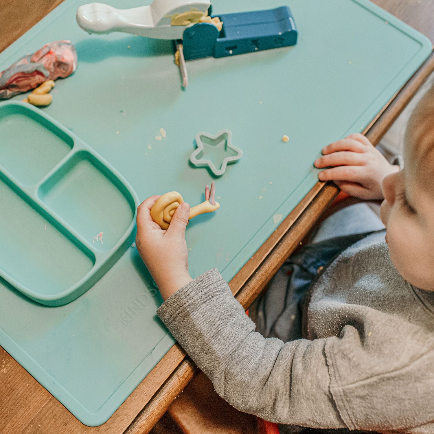 The Kindsgut painting and handicrafts mat is the perfect support for your child when painting, kneading and handicrafts. Thanks to the non-slip underside, the silicone mat not only protects the table, but also ensures that your child can let their creativity run free without worrying about papers flying away or pens rolling. With the practical subdivision, handicraft accessories such as scissors, glue or colored pencils find a clear place and are always ready to hand. The robust mat made of environmentally friendly silicone can be easily wiped off, so that you can paint over the edge without any problems. The subtle color and the childlike shape make the handicraft mat the ideal addition to a colorful everyday family life, which fits stylishly into modern living concepts. Perfect for learning to paint & do handicrafts: