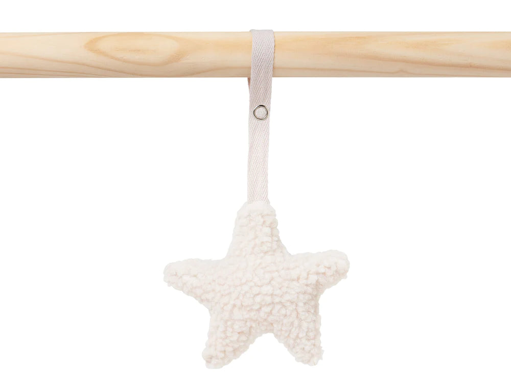 These four play figures are suitable for use in combination with the Jollein wooden baby gym. They are made of soft teddy and come in the colours pink, nougat or green. From approximately 10 weeks your baby will get more need for triggers, playing and looking around. The perfect moment for the baby gym because it provides an extra challenge. Get your wooden baby gym now and decorate it with these love figures in the shape of two moons and two stars. Put your baby in it on something soft and let's play! Your baby will find it fascinating to see the toys moving and will enthusiastically kick its feet or start making sounds when grabbing one of the toys or touching it so that they will start moving even more. The use of the baby gym will stimulate the gross and fine motor skills and it will stimulate the senses. Your baby will soon get more control over its grabbing techniques and will learn that toys start moving when you touch them or grab them. So, the baby gym is very valuable. The baby gym toys from Jollein are delivered without the wooden baby gym. The baby gym is available separately and easy to put together. The Jollein collection has several matching baby gym toys available. You can easily attach and remove the baby toys so that you can change them and the gym will stay interesting and challenging for your baby.