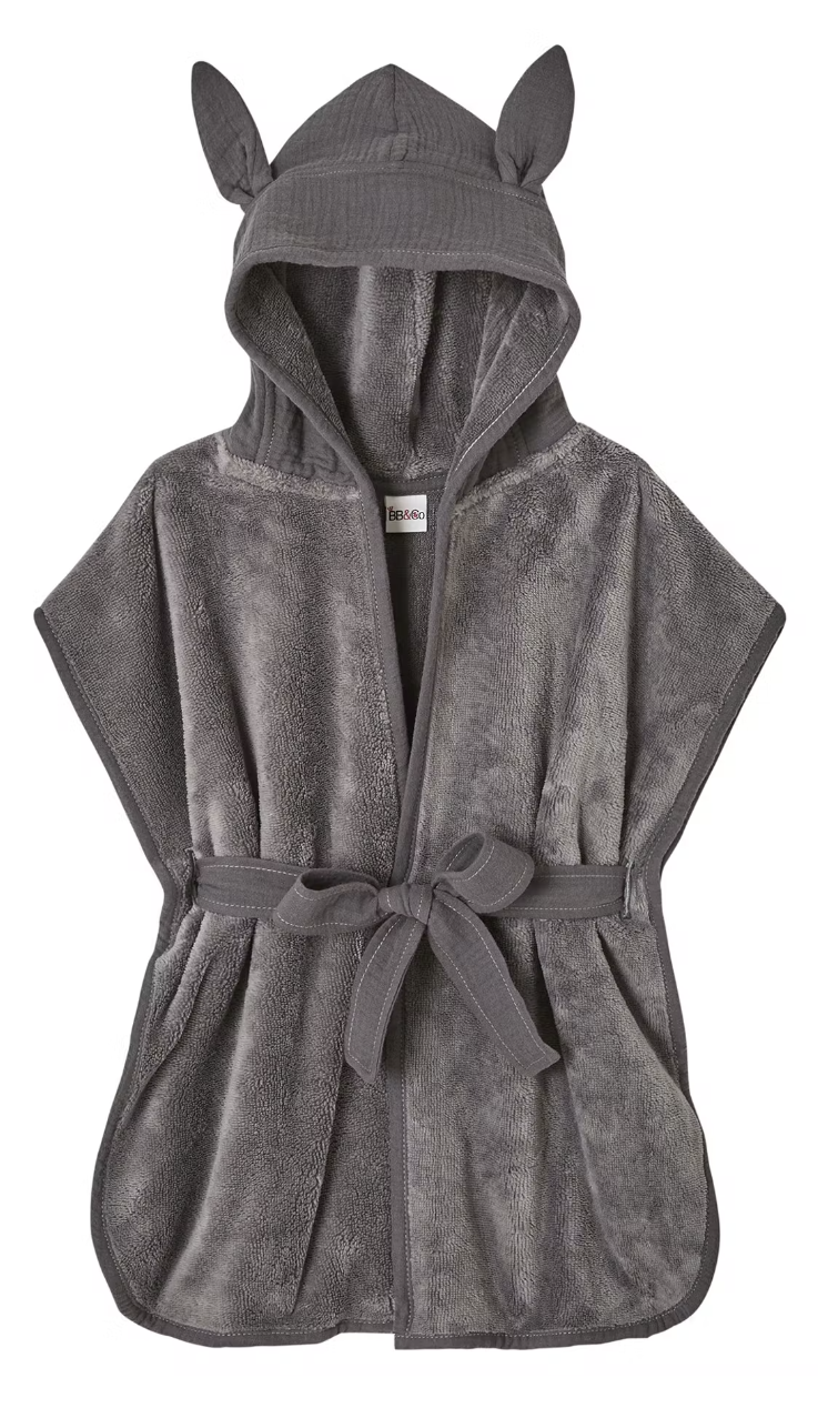 An adorable bamboo terry bathrobe with hood and belt in tone-on-tone cotton double gauze. Small bunny ears on the hood.