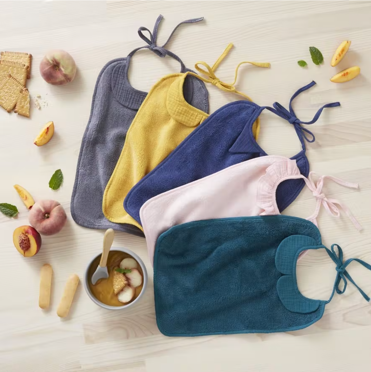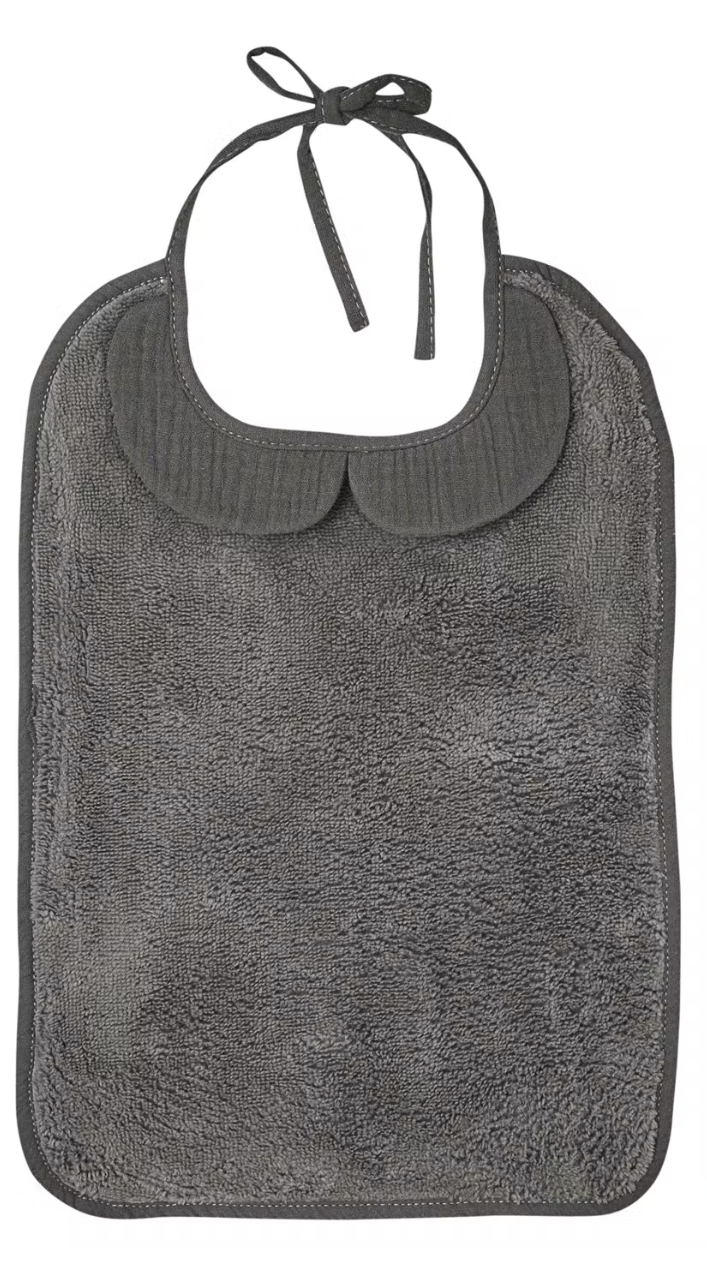 A large chic and trendy bib in ultra soft bamboo terry cloth, with tie and fancy collar in tone-on-tone double cotton gauze.