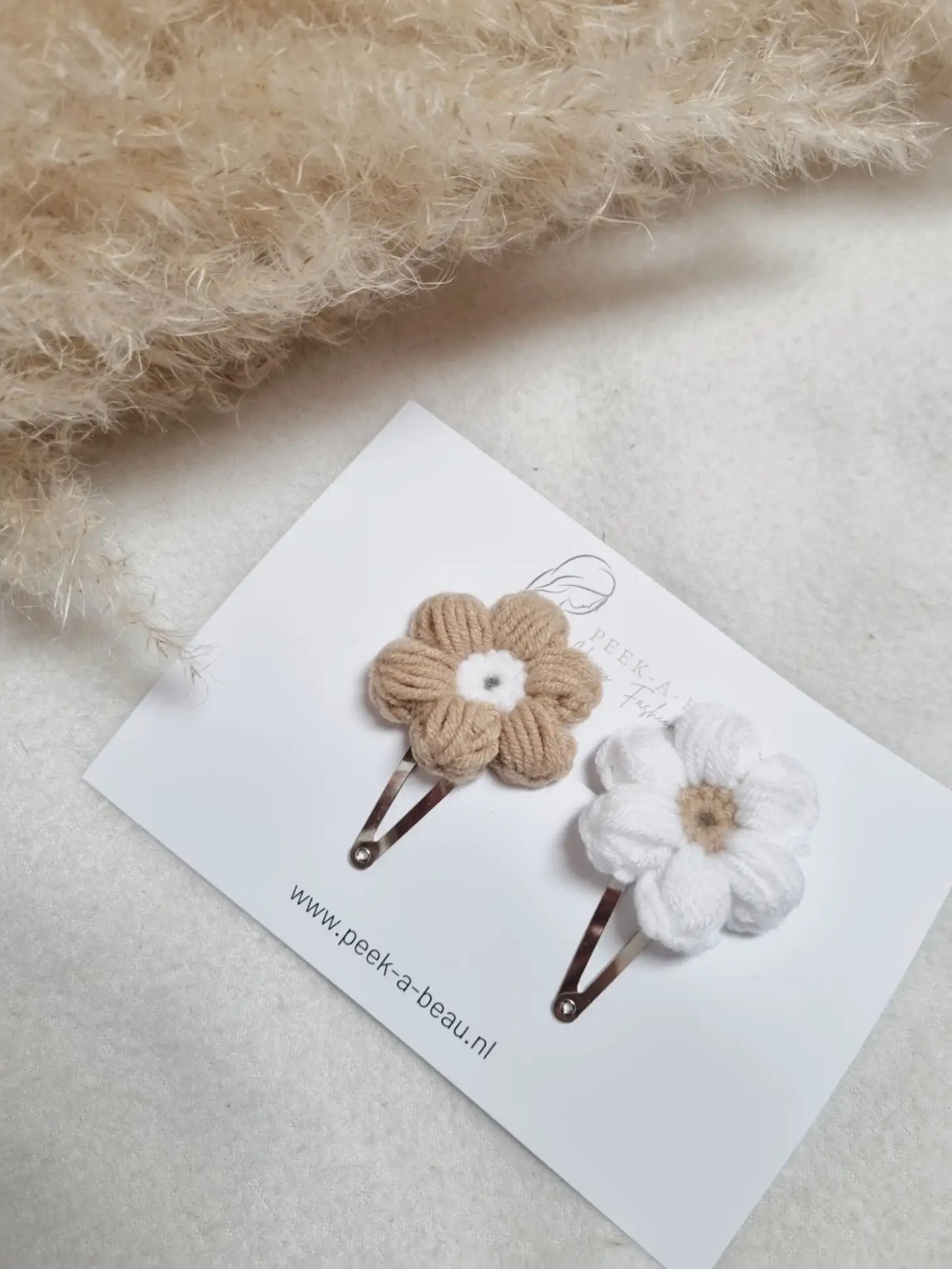The flowers are crocheted by hand, which makes them a unique, but above all very popular product! This is a set of 2 on gold hair clips.