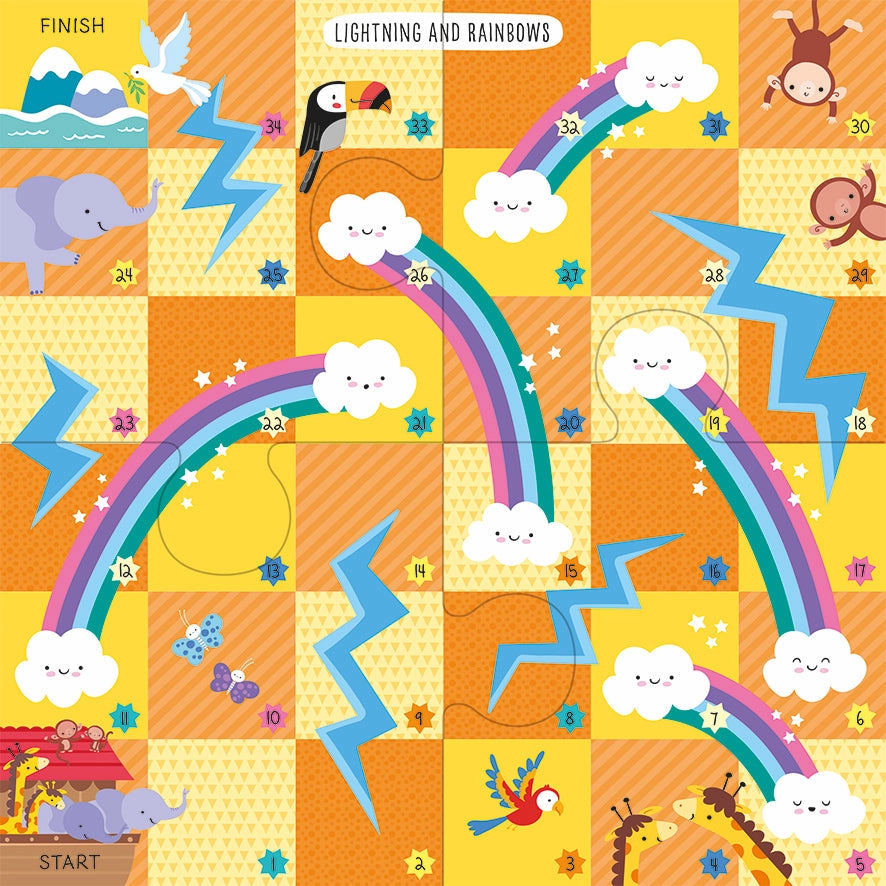 LIGHTNING AND RAINBOWS BOARD GAME: Race to get all the animals on Noah’s Ark safely to dry land. Traverse the board and climb rainbows who will help you on your travels but watch out for lightning storms which will send you sliding backwards and away from the finish line.