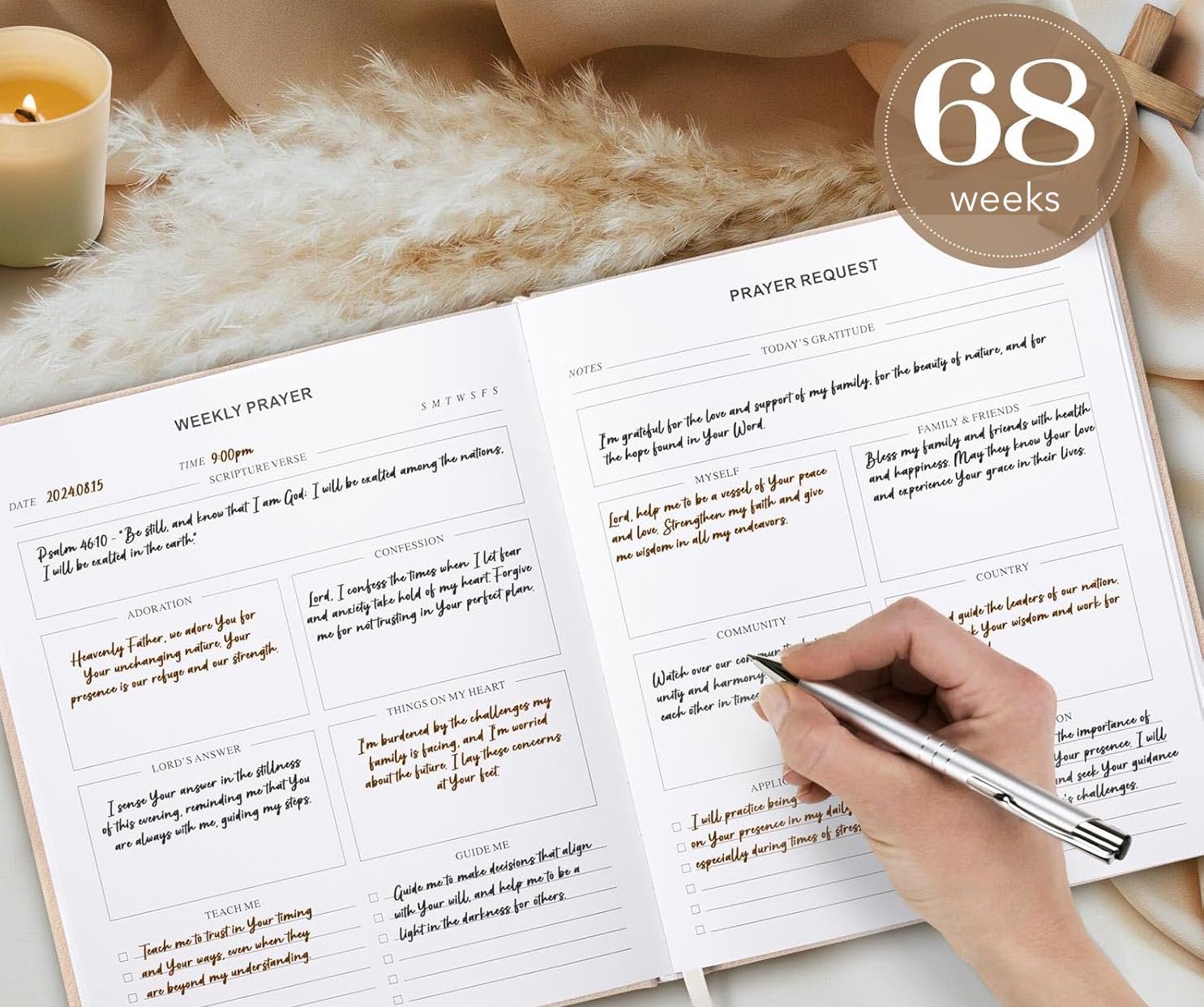 - GUIDED STRUCTURE Our prayer journal journal features 65 weekly prayer pages, Bible passages, and gratitude sections that provide a structured yet flexible space for reflection and writing, supporting consistent spiritual practice