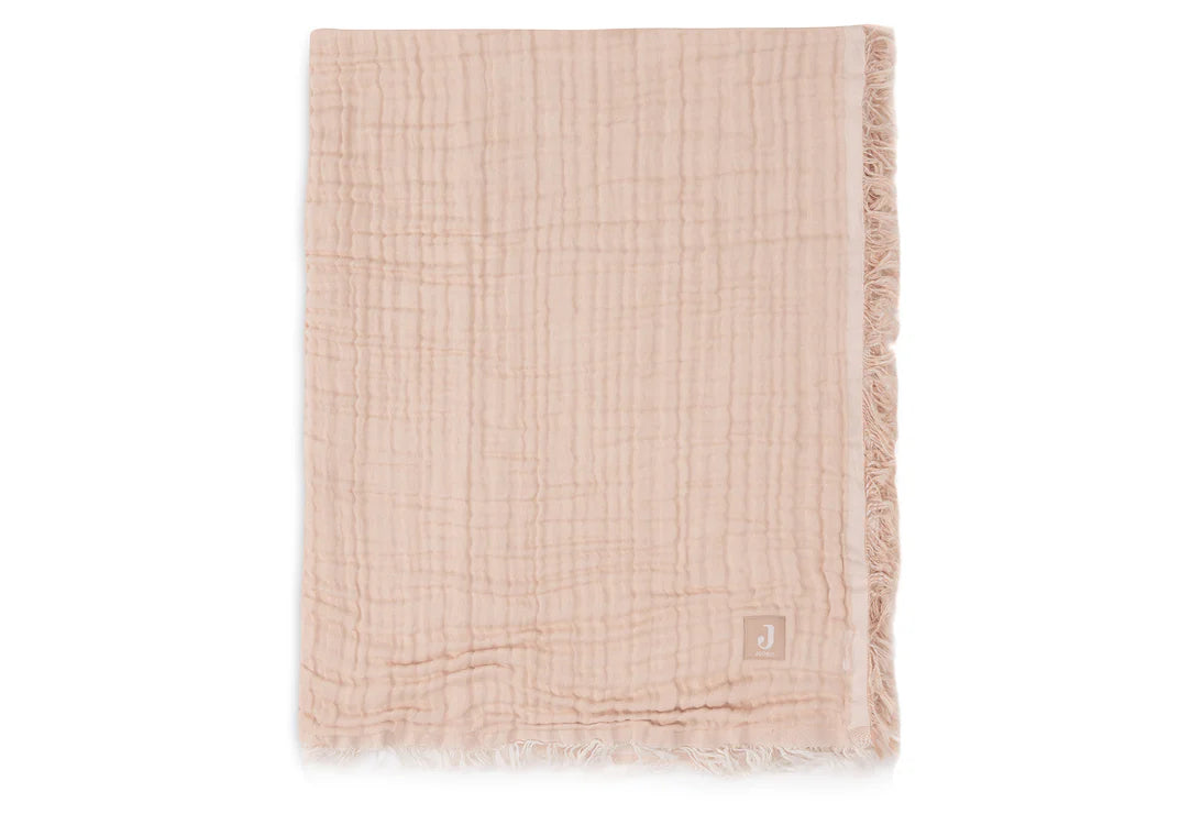 Our muslin blanket for babies with GOTS doesn't only offer softness and style, but versatility as well. Made of soft muslin material, this blanket has a fun fringe on the outside, for an extra charming touch. With a neutral ivory side and the choice between Moonstone or Olive Green on the other side, this blanket offers versatility and style. With a TOG-value of 1.0, this blanket is perfect for keeping your baby warm and comfortable, whether it's in the cradle or stroller or during cuddle time. You can also use this blanket as a big muslin cloth or towel. Create a calming and comfortable sleeping environment for your little one with our muslin blanket with fringe, a practical and versatile item for every parent. Available in 75x100 cm for the cradle and 120x120 cm for the cot.