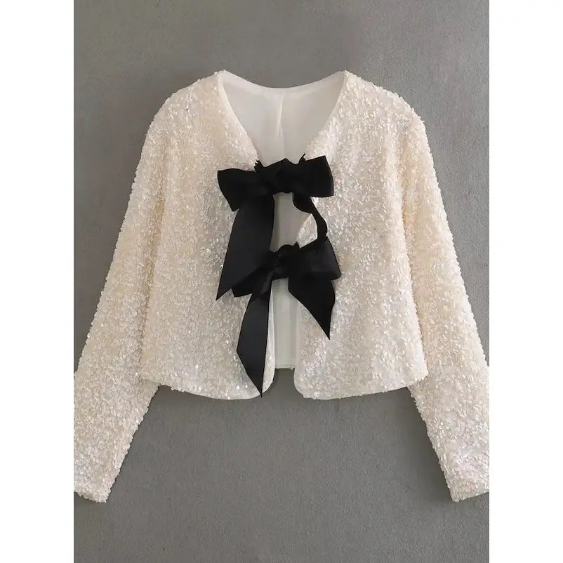 Discover the Bow Sequin Crop Jacket from Miss Sparkling, a brand synonymous with young contemporary apparel and accessories. Our styles are exclusively designed in southern California by a team of talented designers. This jacket is a part of our signature novelty knitwear designs, that range from unique graphics to retro-inspired techniques. It is designed in the USA and manufactured in our own factories in China, ensuring the highest standard of quality.