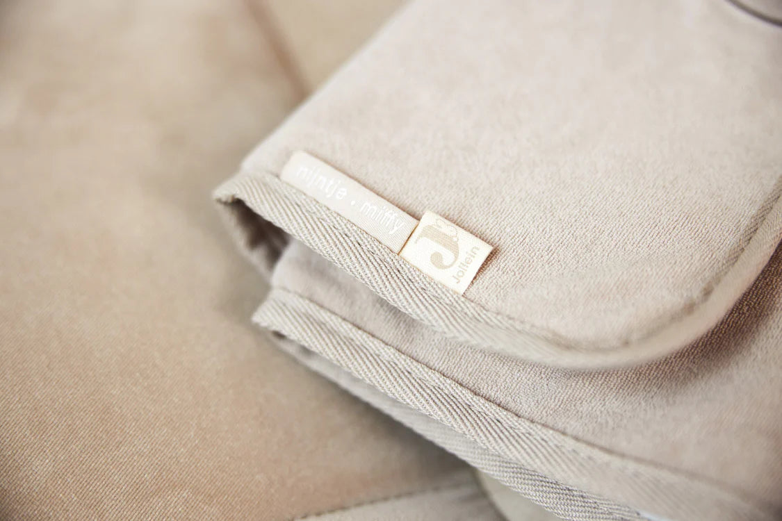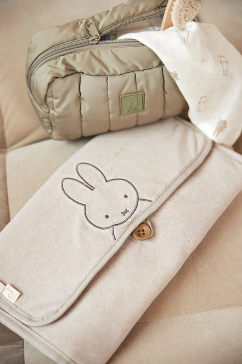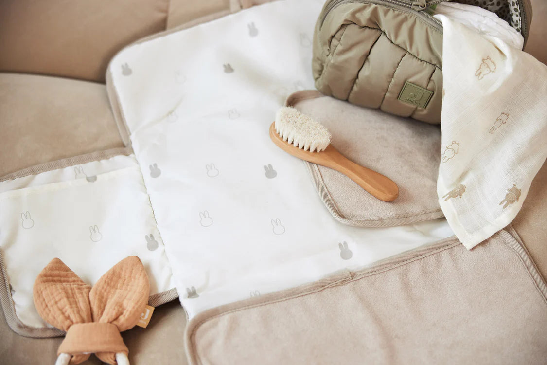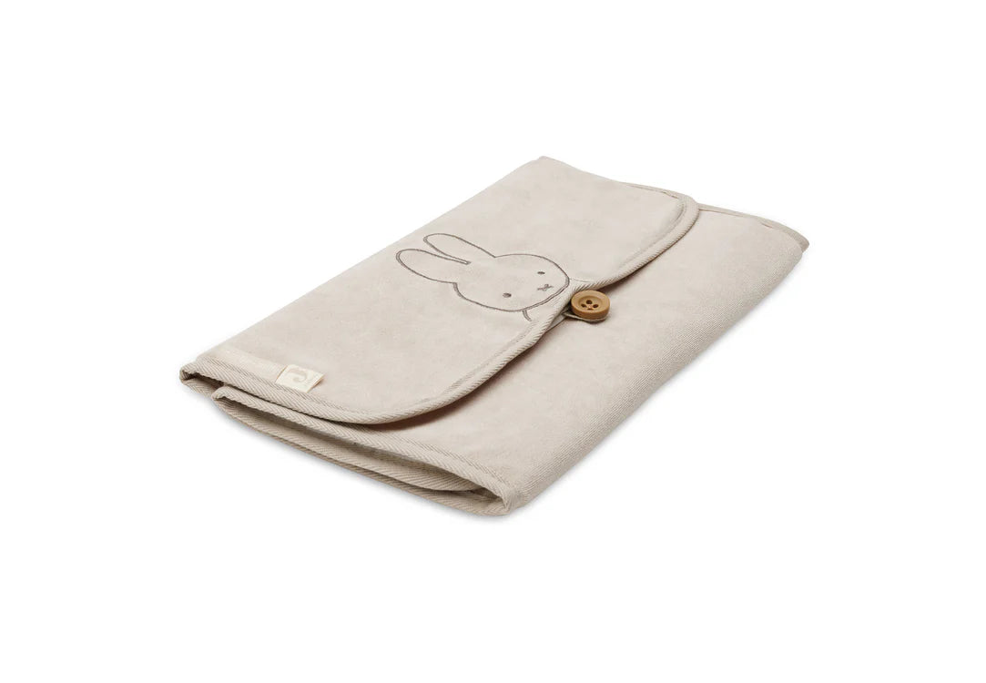Our soft changing mat for babies is a must-have for on the road! This mat, made of cuddly terry cloth, has an adorable little Miffy on the front and a cute all-over Miffy print on the inside. The practical thing about this changing mat is that the inside can be wiped down with a cloth, making it very easy to clean. After use, you can easily close the mat with a loop and a wooden button. This makes the changing mat not only practical, but super adorable as well! Keep your child comfortable and change them in style, wherever you are, with our Miffy changing mat. Shop it in olive green or nougat.