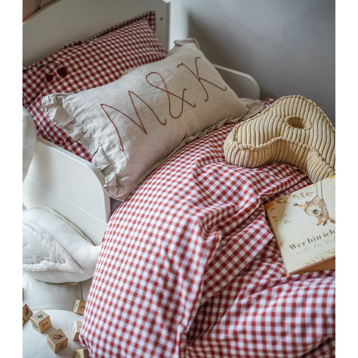 Fastened with a zipper, the pillowcase is decorated with an embroidered application in the shape of a cherry.