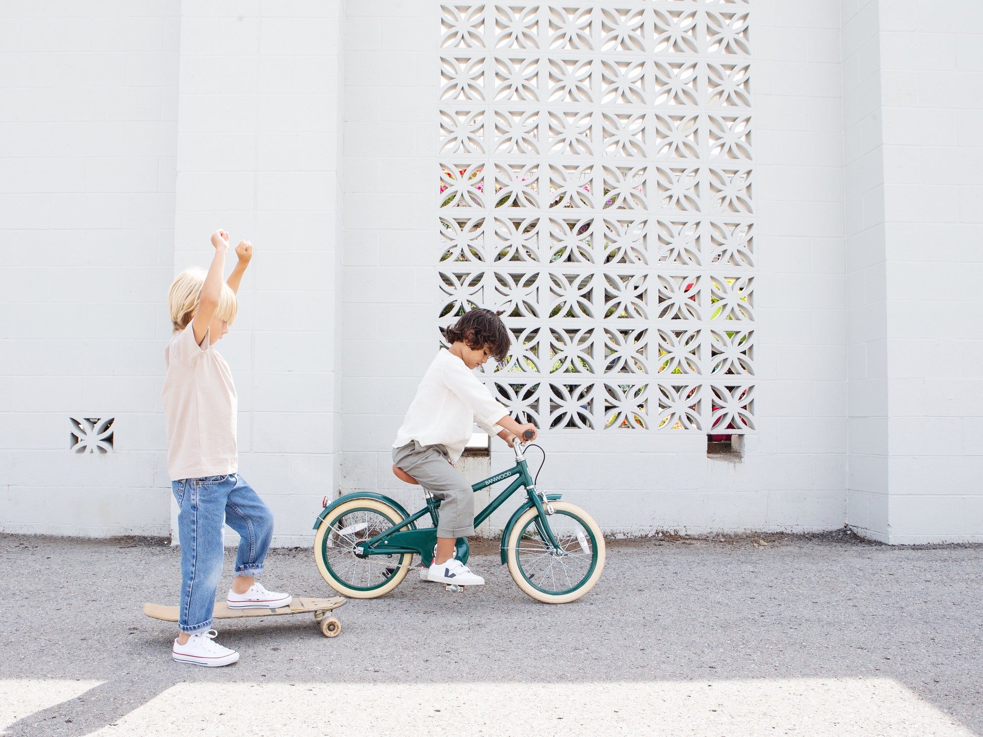 Vintage children’s bike with 16” tires, has a nice balance of Scandi and timeless design. This kids’ retro bike is suitable from 4 to 7 years and comes with stabilisers (training wheels) to use until they are ready for two wheels.
