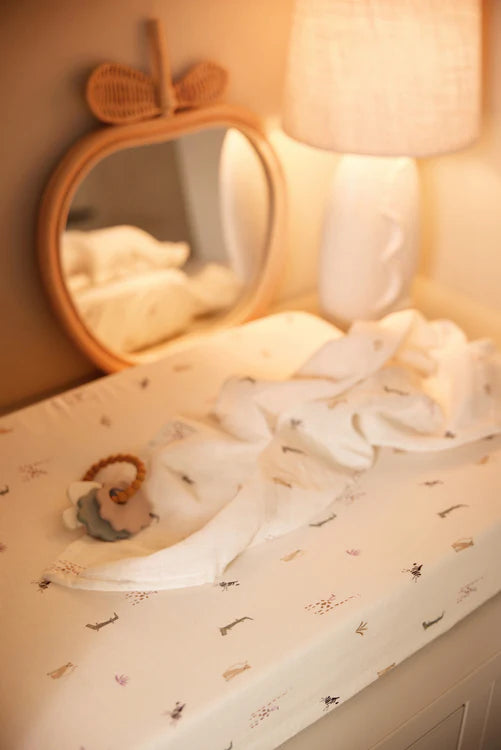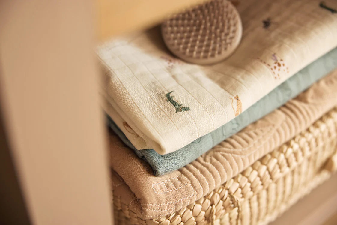 A muslin cloth is an item you regularly use for babies, but also for toddlers. You can use muslin cloths as wash cloths, mouth cloths, changing mats for changing the baby, but also to prevent stains on the fitted sheet in the child’s bed or on the go as a blanket. The possibilities are endless. The muslin cloth in Jungle Jambo print has cute cheetahs in neutral colours with lilac and green details. We’re in love with this cute print! These muslin clothes of 115x115 come in a 2-pack, ideal!