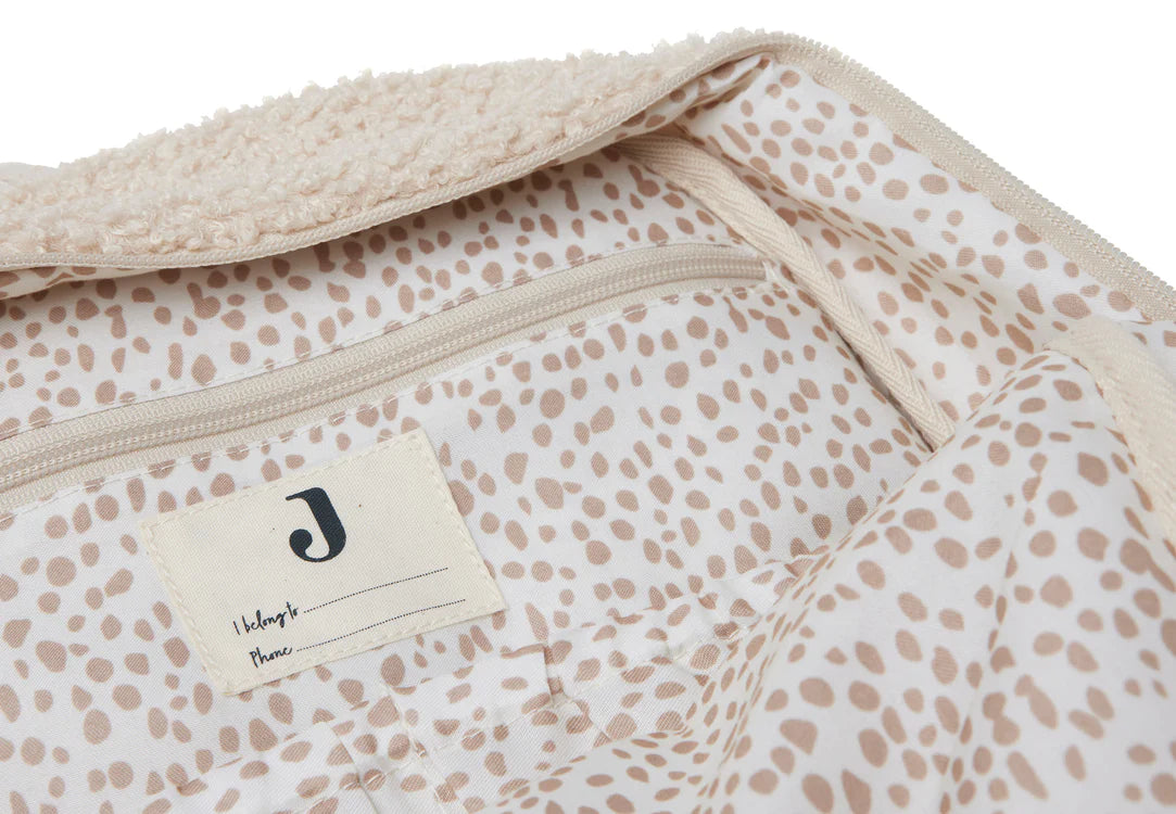 Boucle, it's soft, pettable and super trendy. This fun theme includes a backpack, a pouch and a changing mat. All practical items, all modern must-haves. The theme is available in the colours biscuit and naturel, and can be easily combined with all kinds of colours and prints.