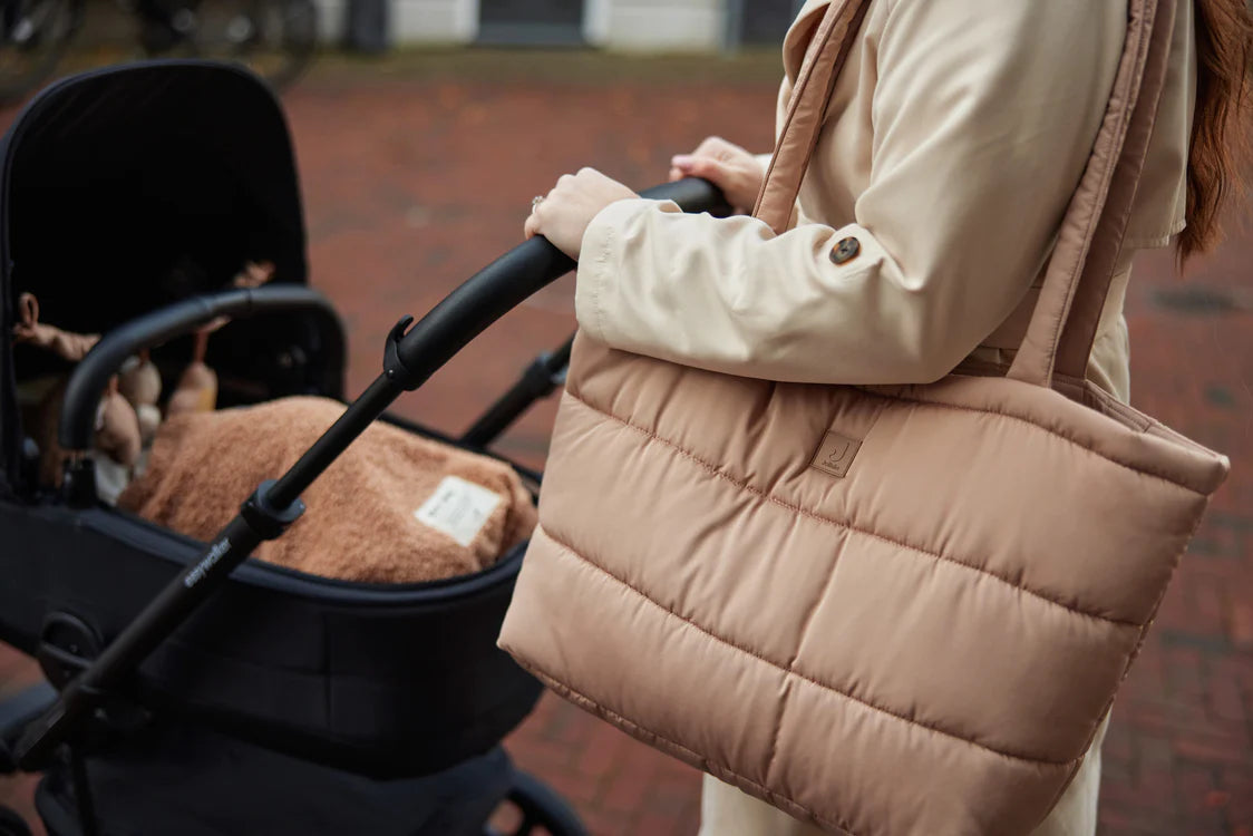 The perfect puffed mom bag! This bag is perfect when you're going on an outing with your little one. This bag is perfect for when you go on an outing with your little one. Of course, you can also use the bag for yourself, as a gym bag or a school bag. The bag is made of 100% recycled polyester, and it has a cute polka dot print on the inside. Furthermore, the inside offers 2 extra compartments and the bag comes with an included changing mat. The bag closes with a button and there is a zipper in the inner pocket. The bag has extra long handles, so that you can not just carry it on your shoulder, but also cross-body or on the stroller.