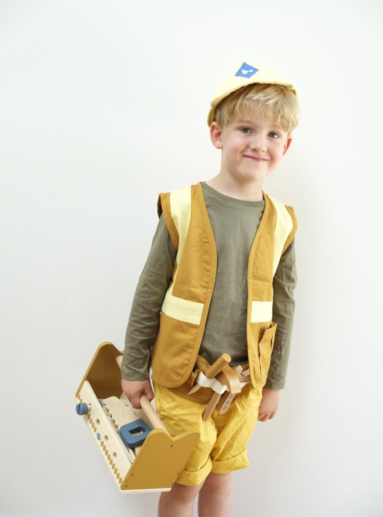 Cool and comfortable workwear is always in fashion and of course little builders need to have proper attire for many hours of play and work! Put on Fabelab's Builder set and be ready for the challenging work on a construction site. Your little construction worker will be ready for the job with Fabelab's bright orange vest, safety helmet and utility belt. This Builder dress-up set is made from comfortable organic cotton and lots of fine details. An easy fit dress-up set for all the little busy builders, who want to stay safe and cool while building.The Dress-up set is made for many hours of make-believe and adventures and is perfect for encouraging your childs imagination. Fabelab's wooden My First Toolbox set has play tools that fits into the utility belt and can be bought seperately to the dress-up set.
