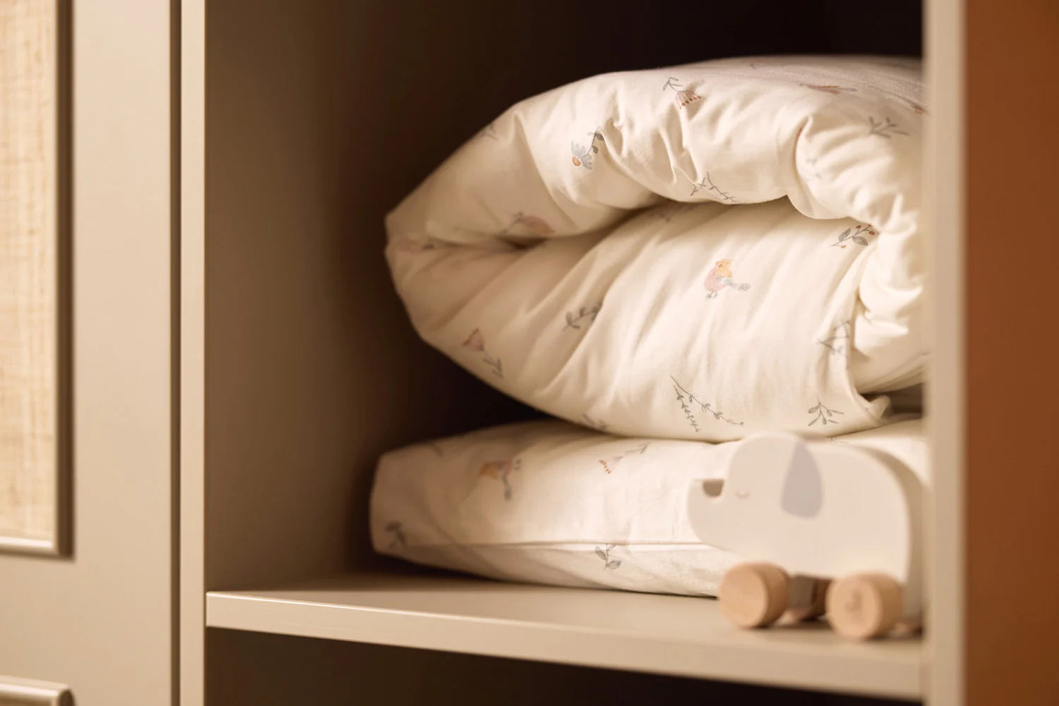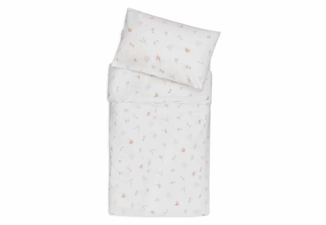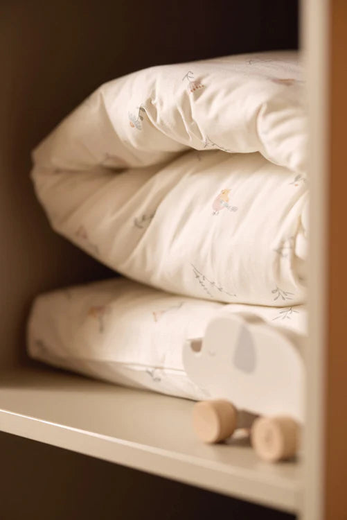 Our cute duvet cover with Lovely Birds print is suitable for the duvet size that fits in a cot. The cover has a handy opening at the bottom to easily slide the duvet into it, it also comes with pillowcase. Cuteness overload as the Lovely Birds print is infused with tenderness and elegance, perfect for creating a lovely atmosphere in the nursery. The Lovely Birds print brings an enchanting scene of birds, flowers and twigs and takes you into nature. Lovely Birds is not only incredibly cute, this print is also great to combine with our neutrals and other prints.