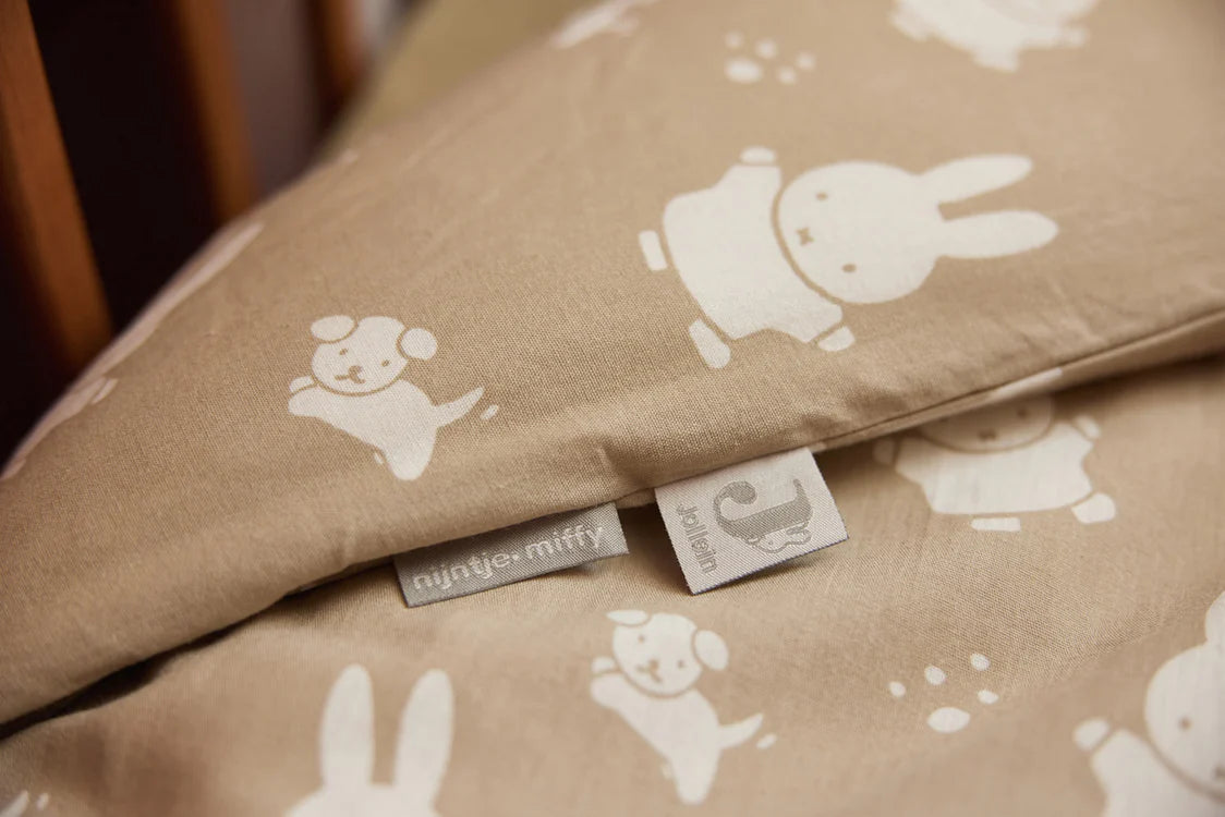 So cute! This duvet cover has an adorable Miffy & Snuffy print. A duvet cover is ideal to protect the duvet, and it's also a true eyecatcher in your kid's room. You can safely start using a duvet when your toddler is 2 years old. A duvet is cosy and warm, and it looks cute. This adorable duvet cover with Miffy print is perfect for the size of duvet for a cot. The duvet cover has a practical opening at the bottom so you can easily put the duvet in, and a pillowcase is included. If your little one is already sleeping with a pillow, you can make it match the duvet cover. Available in Olive Green and Nougat. Did you know that Jollein has all the best basics for your little one's bed? Complete the set with a flannel, fitted sheet and duvet from Jollein. Add the finishing touches with a cute mosquito net.
