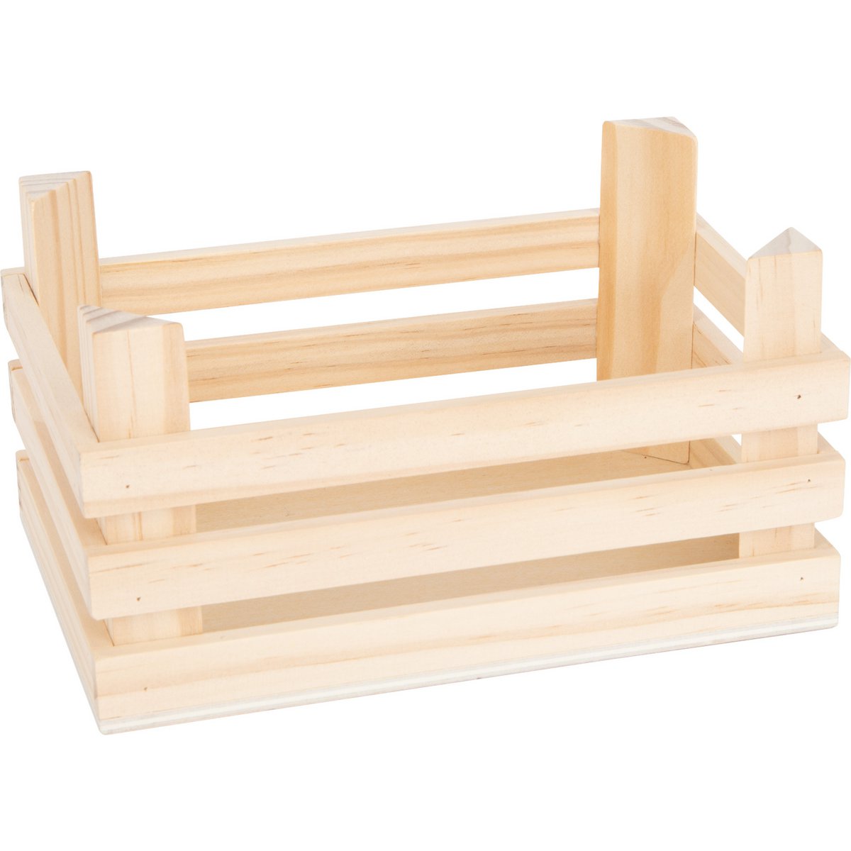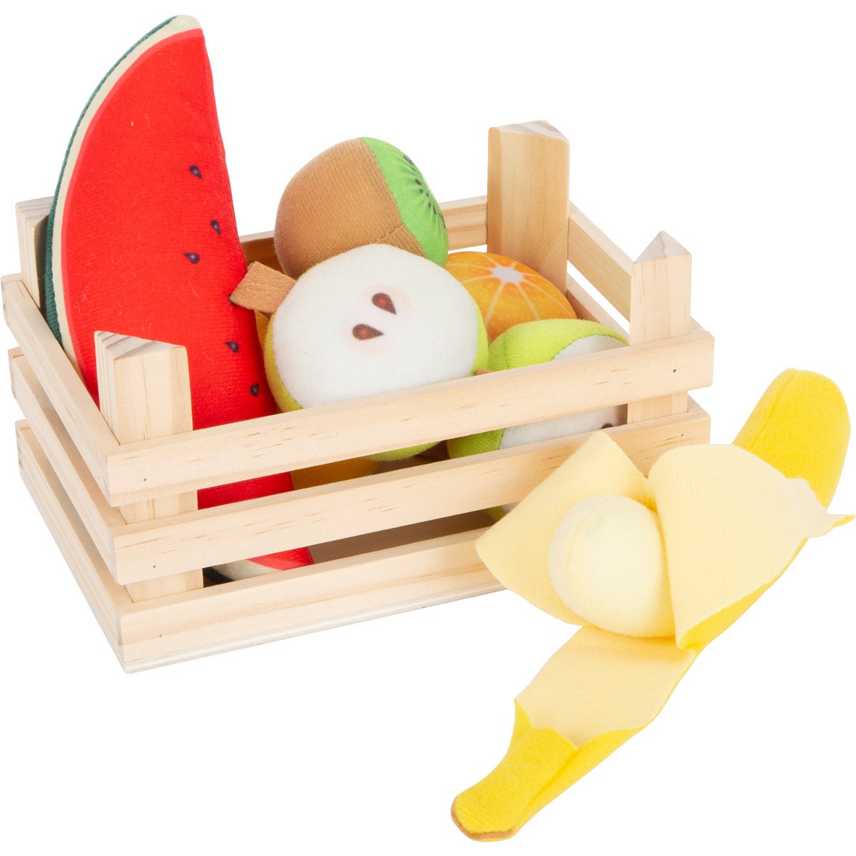 The wooden fruit box is filled with two apples, two oranges, a kiwi, a melon and a banana made of soft plush.