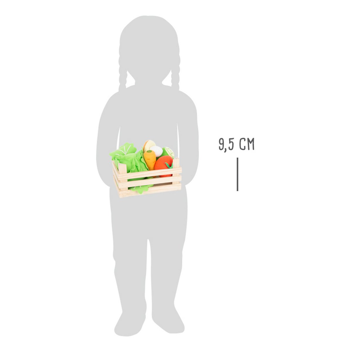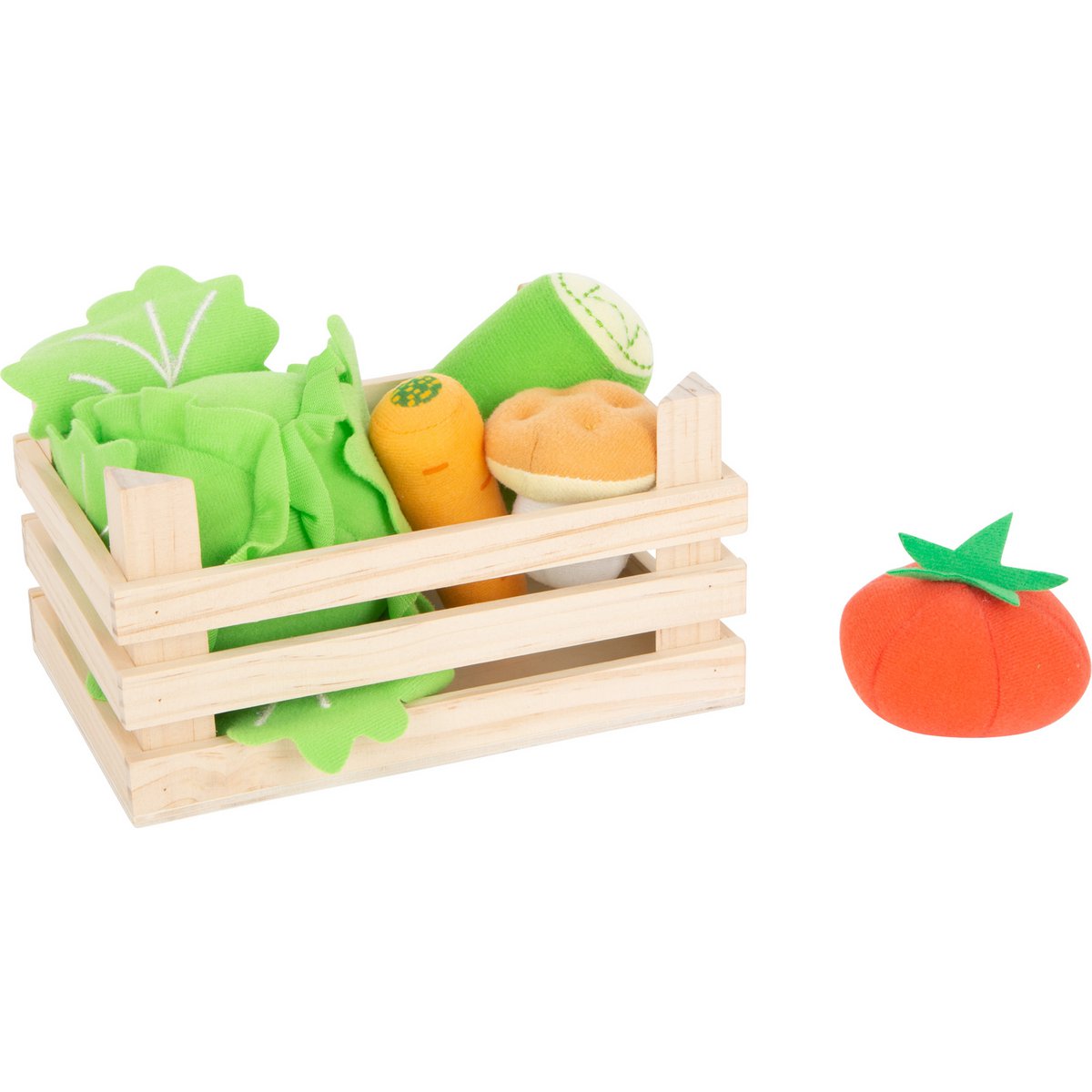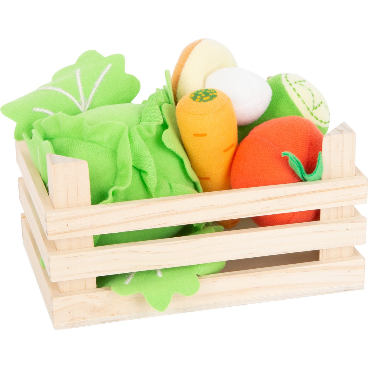 The wooden crate is filled with a cucumber, a carrot, a tomato, a mushroom and a head of lettuce made of soft plush.