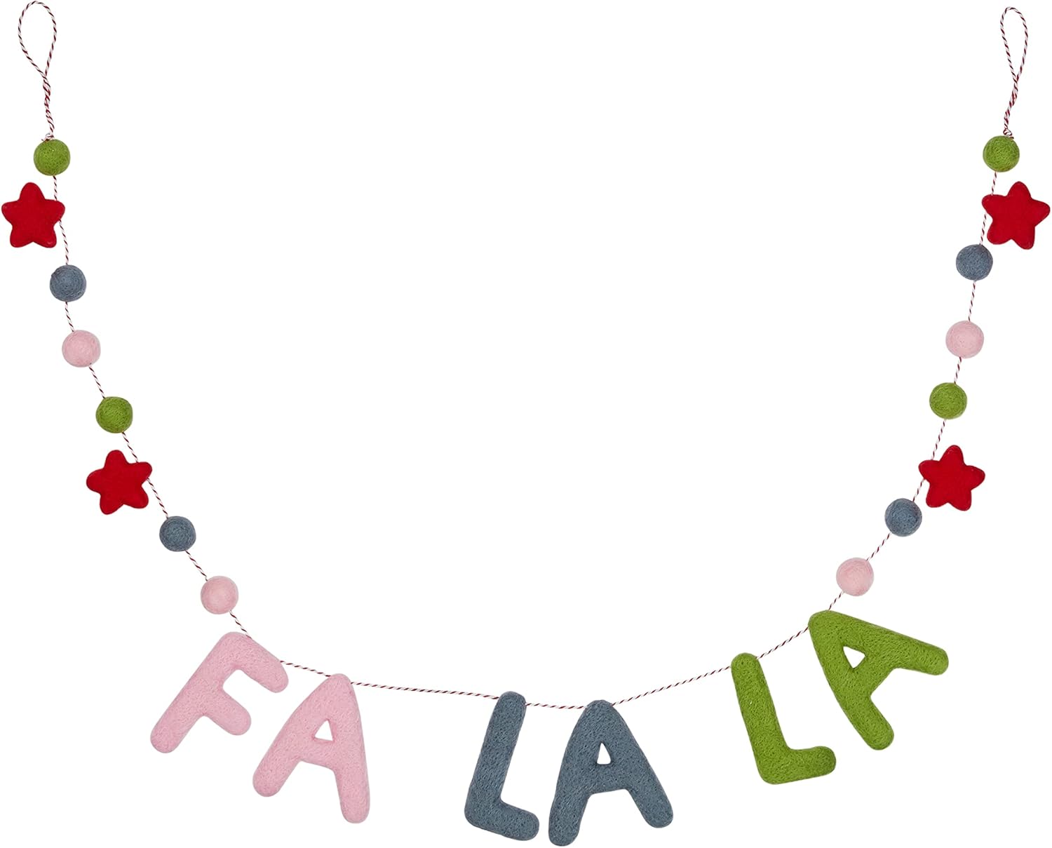 Felt letters in pink, blue and green give the words "FA LA LA" in reference to the cheerful Christmas Carol "Deck the Halls". In addition, the 1.45 m long garland is decorated with pompoms and red felt stars.