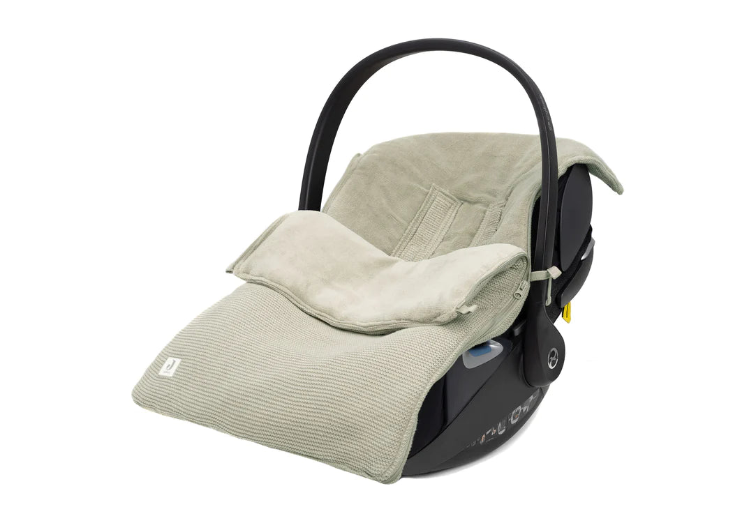 The knitted fabric on the outside of this footmuff gives it a chic look and the ultra-soft fleece on the inside ensures that your baby is extra comfortable. A footmuff is really a godsend. You can easily put your baby in the footmuff by first unzipping the bag completely. You can also easily remove your baby from the car seat by unzipping the footmuff completely. You can quickly make a hood out the top of it with the push buttons, so that the head also stays warm as soon as you carry the car seat outside or go for a walk. To ensure that your baby doesn't get too hot in the car, open up the zipper of the bag as far as necessary. In short: a super handy comfort bag for The footmuff has openings in the back to make it extra easy to fasten the belts. It is a universal footmuff for the Maxi Cosi and any other brand of category 0 car seat with three or five point belts. You can also use this comfort bag in the pram. Your baby will be warmly wrapped up for the walk in no time.