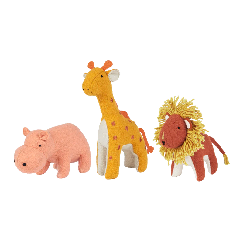 Handmade from a soft wool blend with embroidered features, these three Savannah friends are the perfect size for small hands and are wonderful prompts for hours of imaginative play.
