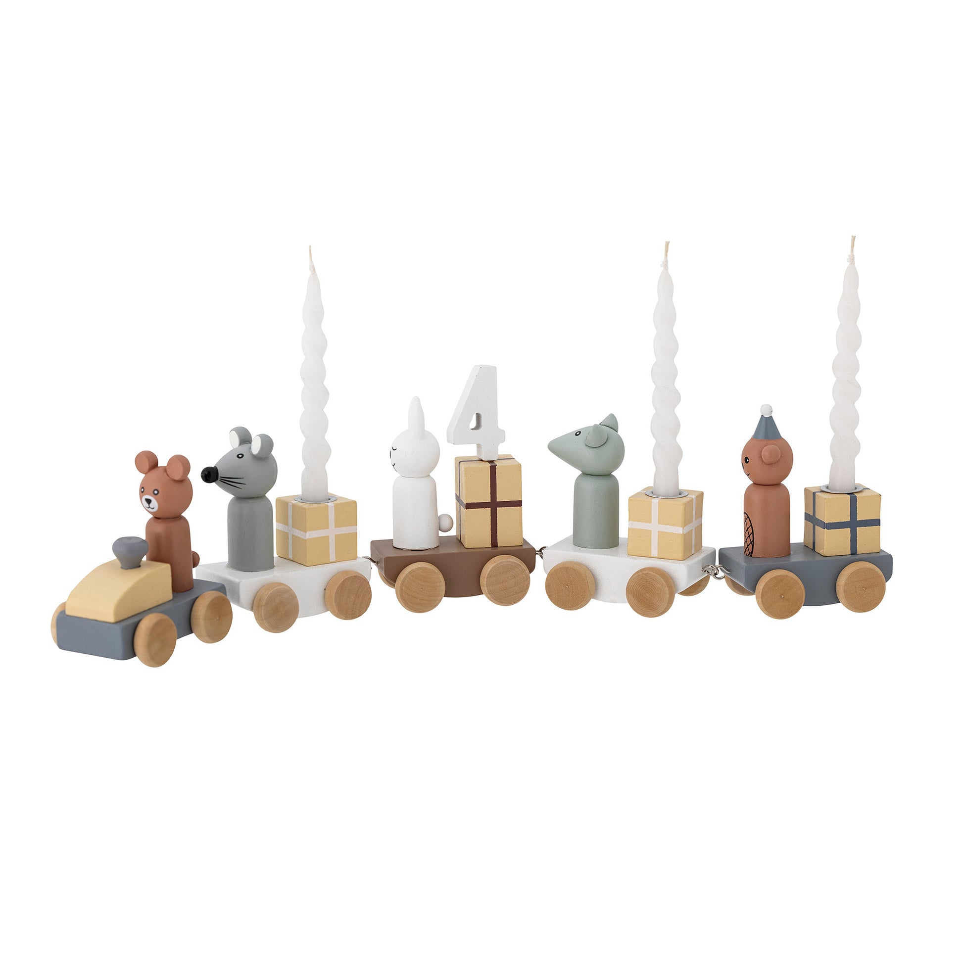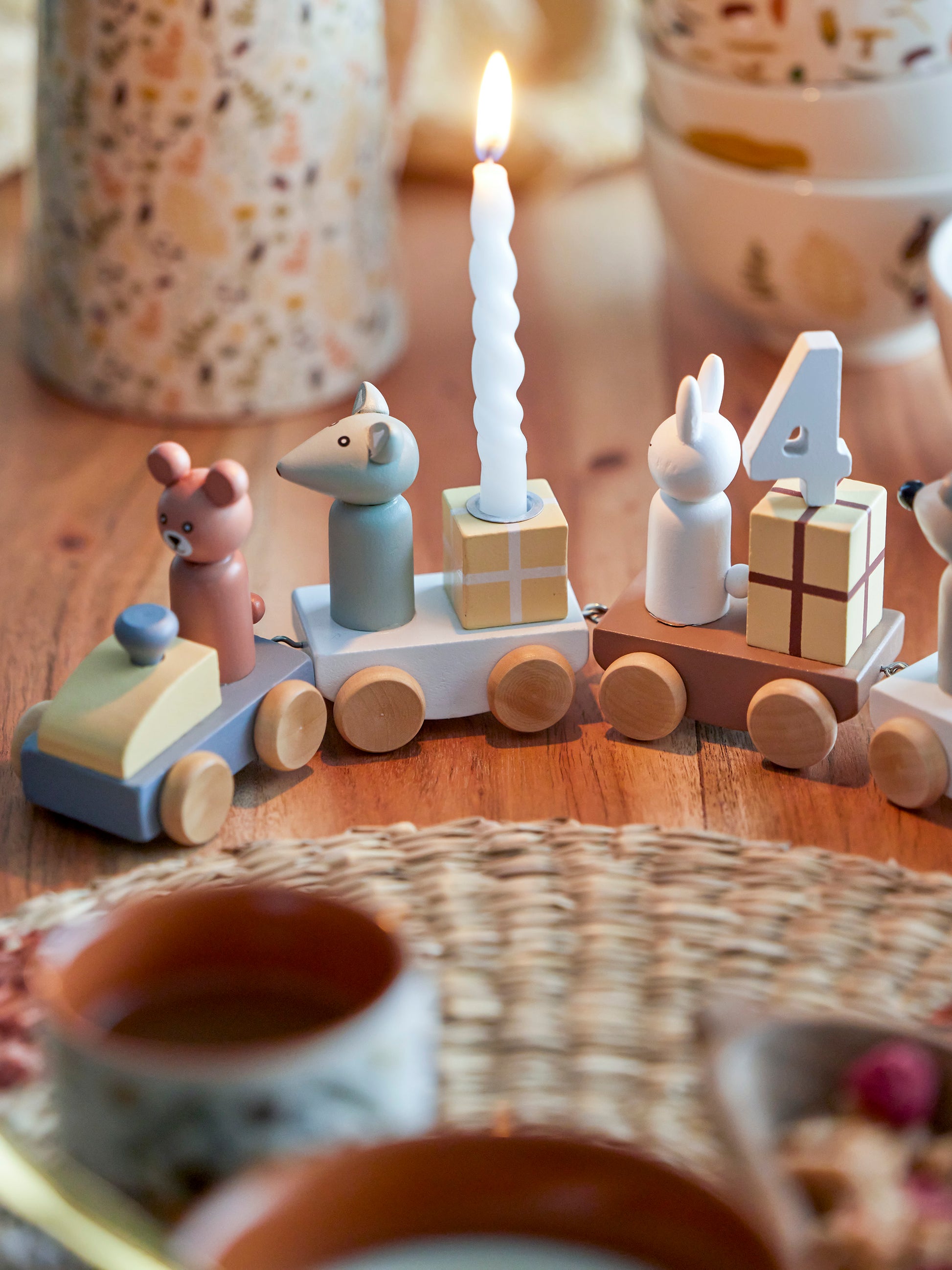 | About the product | Make every birthday celebration extra special with the Junaid Birthday Decoration by Bloomingville MINI. The festive train consists of five carriages with charming gifts and cute animals in soft colors. The cozy train comes with numbers from 0-9, can contain three candles, and is perfect as a year-round decoration in the nursery or children's room. The set arrives in a lovely gift box, making it an ideal present for baby showers or christenings. |