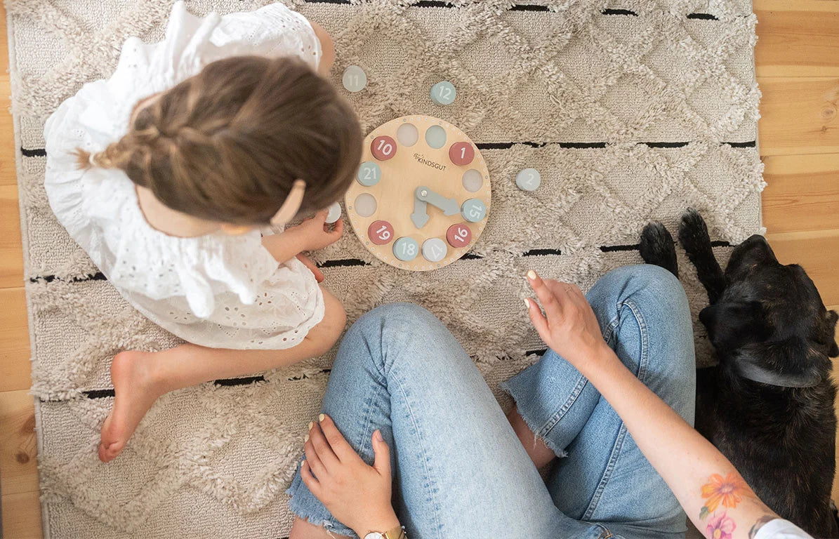The Kindsgut learning clock made of wood combines cute unisex design with high quality - for long-lasting fun. The individual parts made of robust and equally light wood feel wonderful in the child's hand thanks to the curves and ensure that learning the time is a lot of fun. The plug-in clock consists of 13 parts so that your child can not only learn what time it is in a playful way with the adjustable hands - but also have to put the numbers in the correct order beforehand and thus improve their counting skills. The pedagogically valuable learning toy is therefore the ideal support for promoting your child's cognitive abilities. Depending on the developmental level of your child, the learning clock is suitable from the age of five.