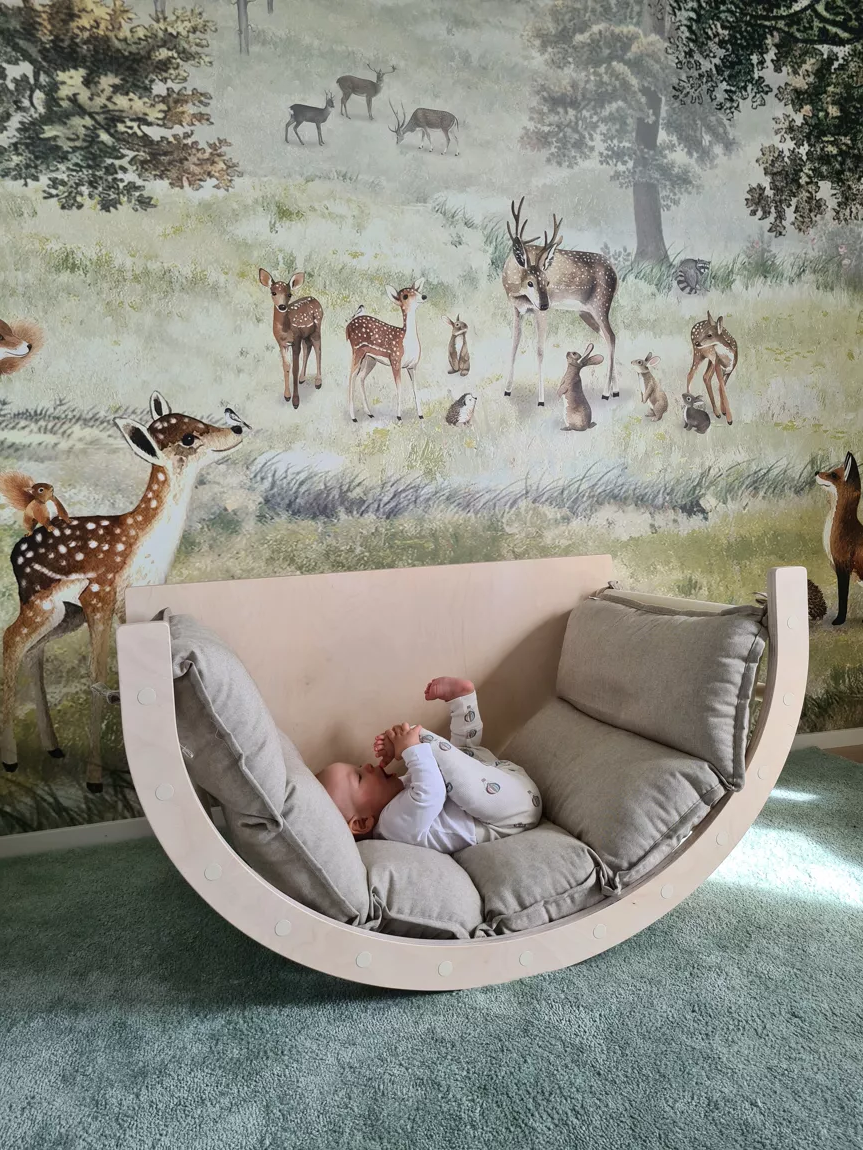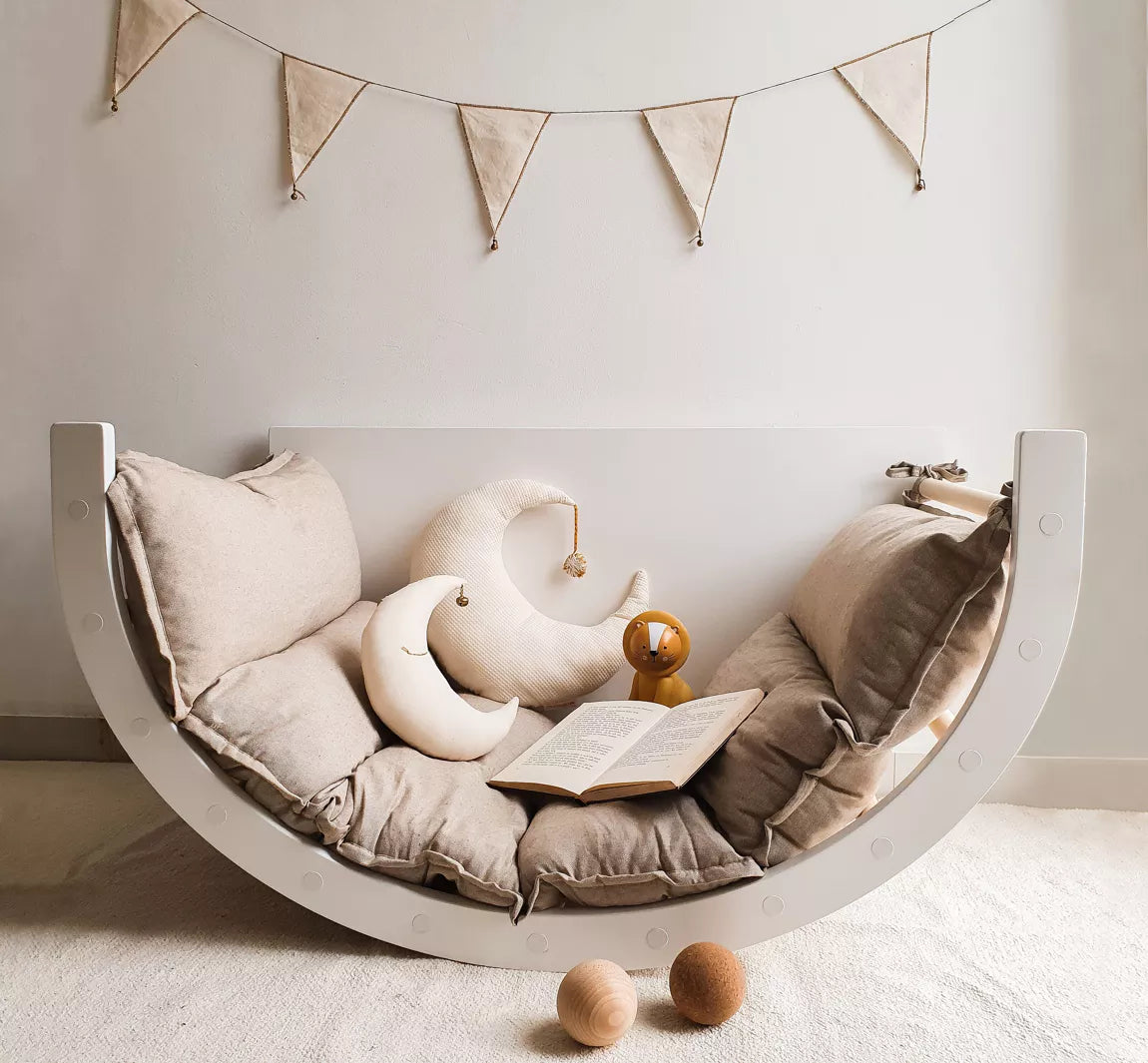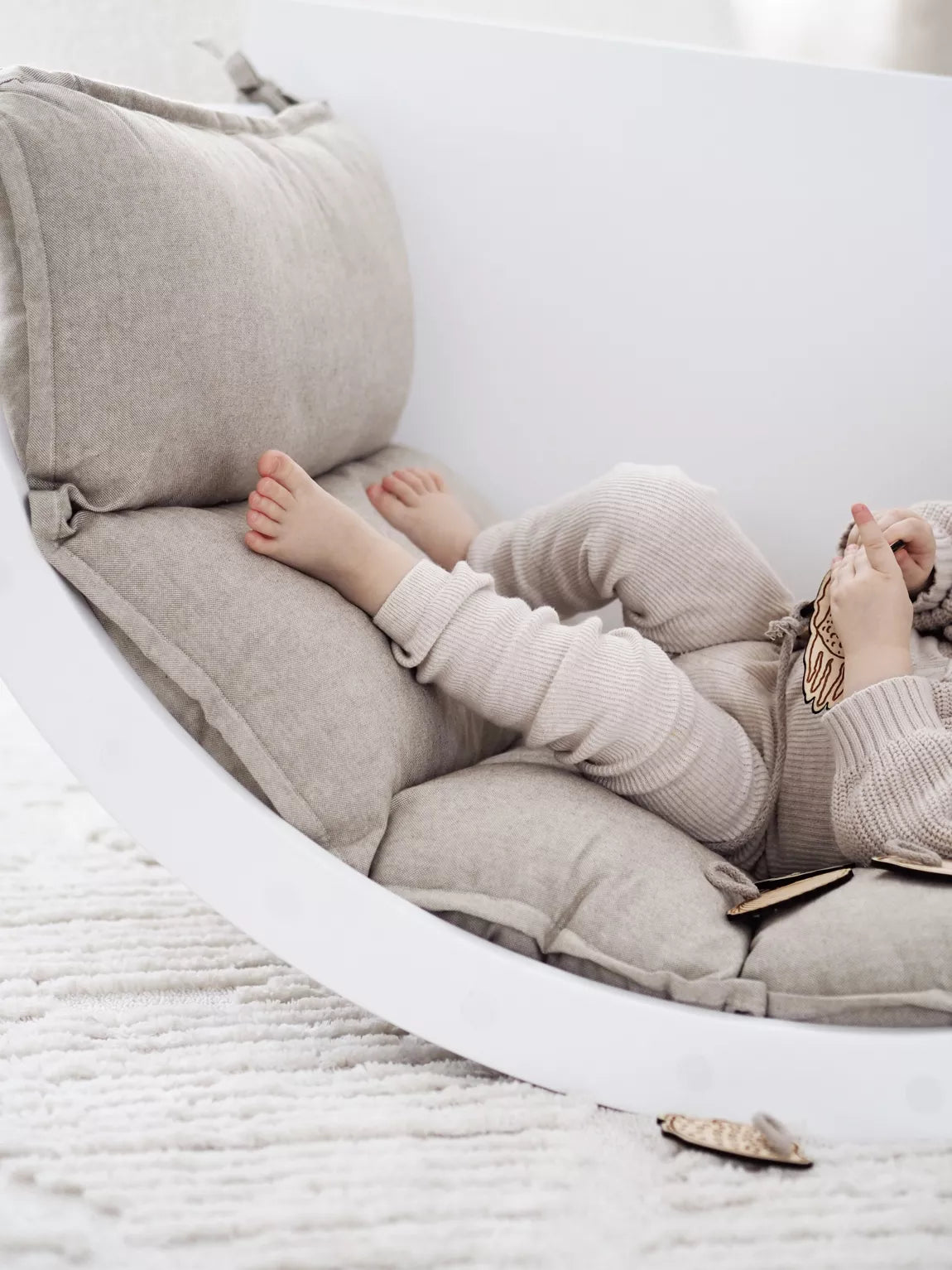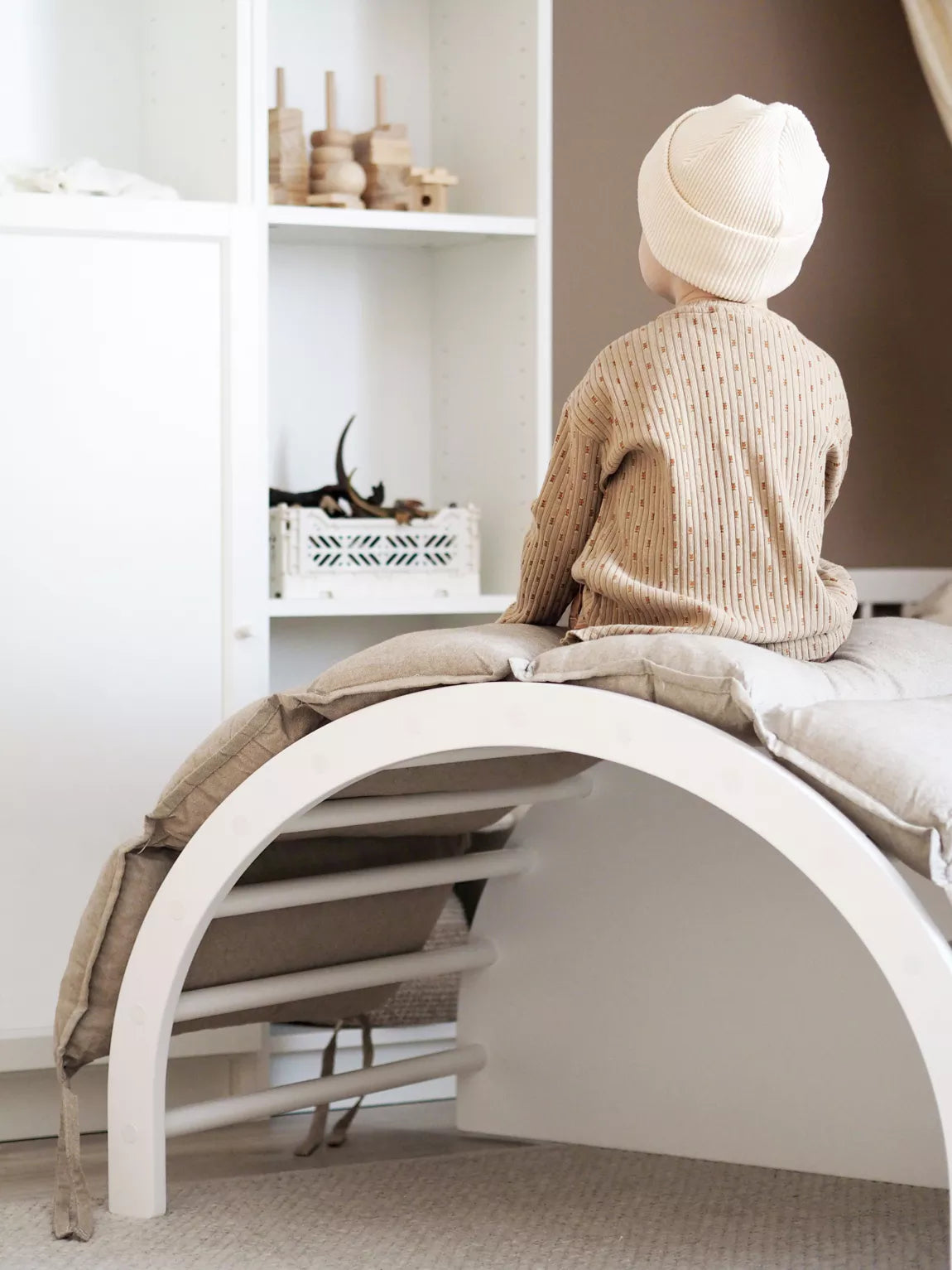 The KAURA cushion is designed for use with the LUOTO climbing arch when the arch is turned upside down and used as a rocker. The pillow is soft and fluffy, making rocking a comfortable and calming experience.