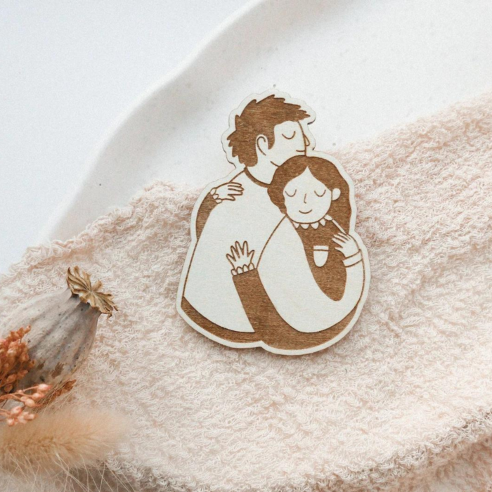 Magnet couple wooden on postcard - fridge magnet hug