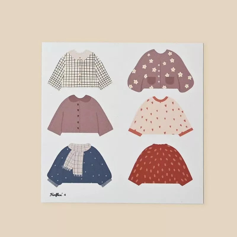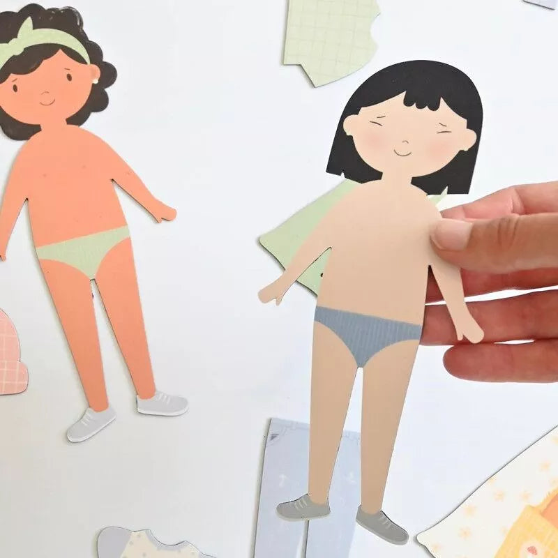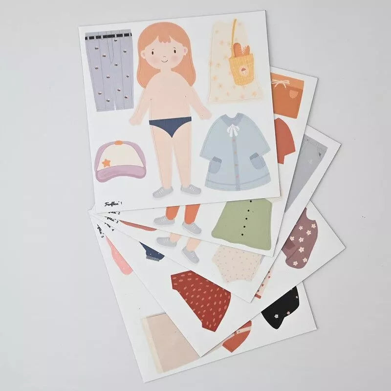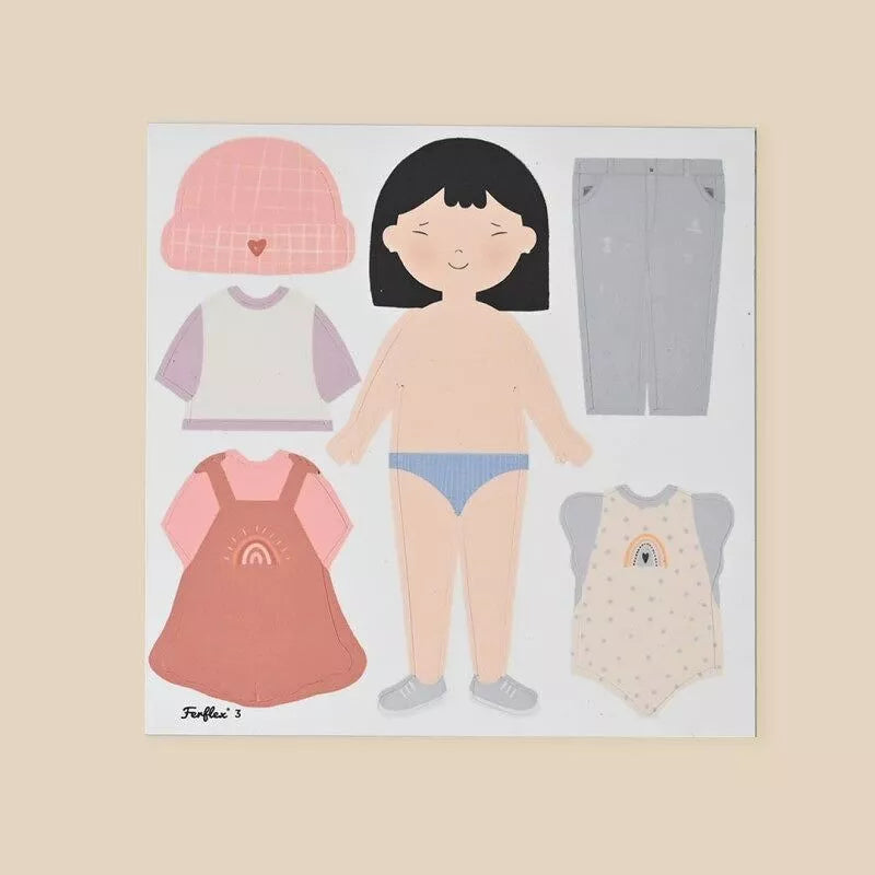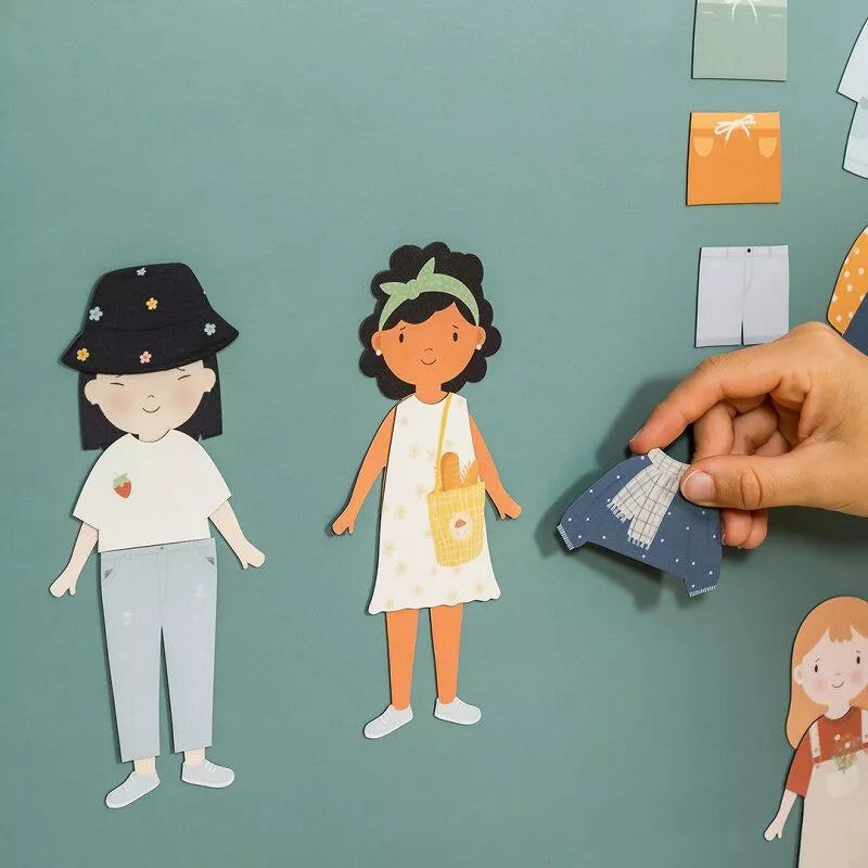This game consists of 3 flexible magnetic silhouettes and 26 flexible magnets that represent different pieces of clothing and accessories, allowing children to create unlimited combinations.