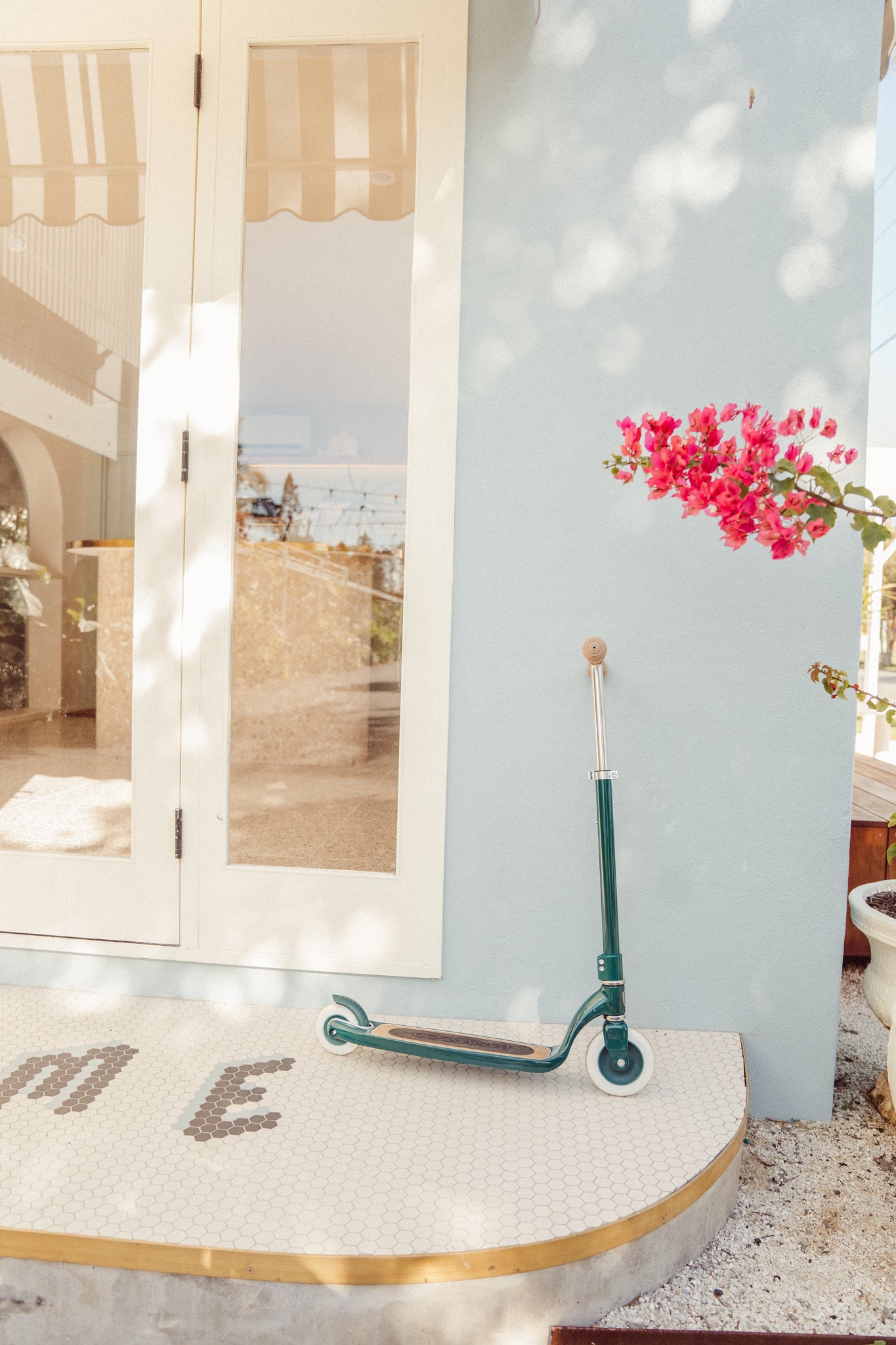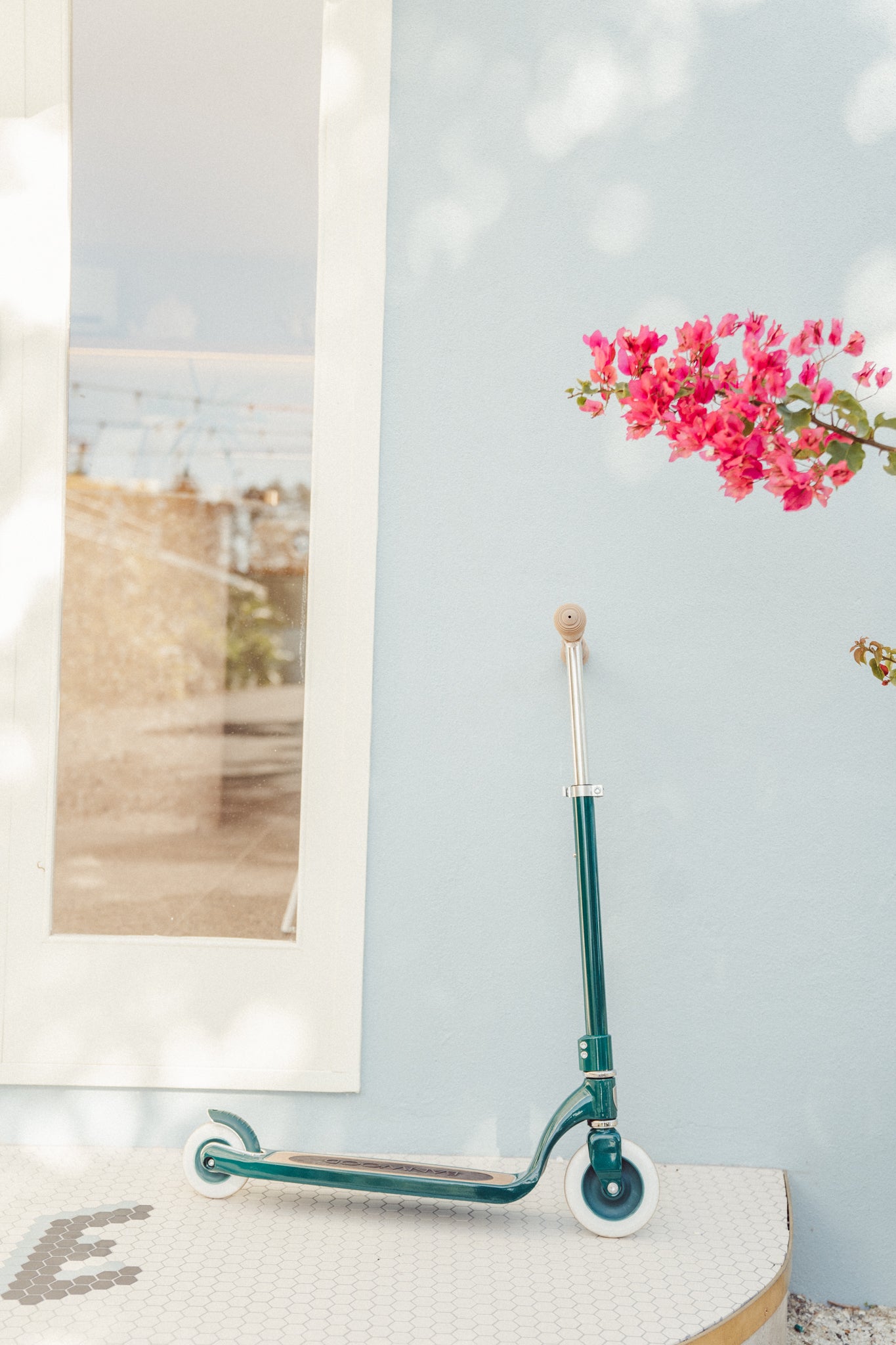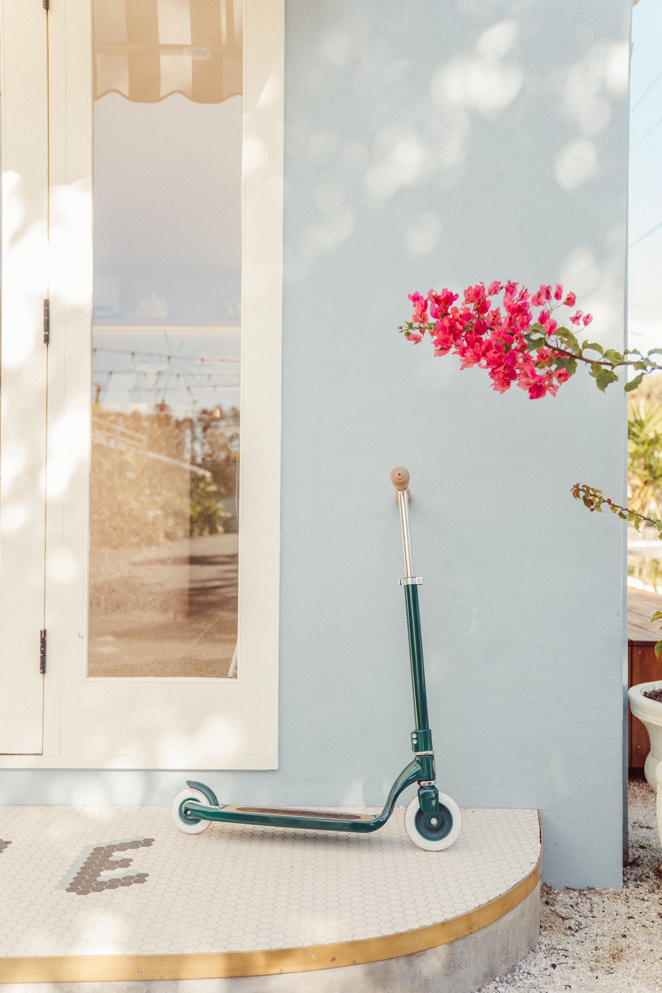 This green two-wheel scooter is built to last the test of time and is equipped with an ergonomic T-handlebar that can easily be adjusted to your kid’s height, a lightweight aluminum frame, classic steering system – just like a bike, vintage-inspired rubber grips and a wooden oak anti-slip deck for a safe ride.