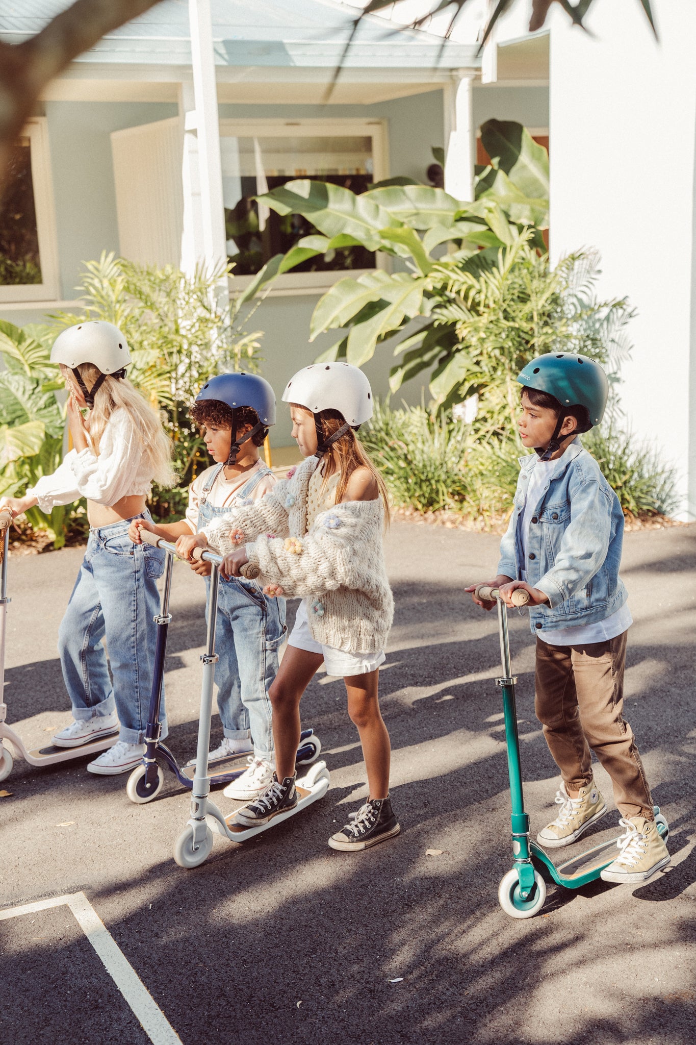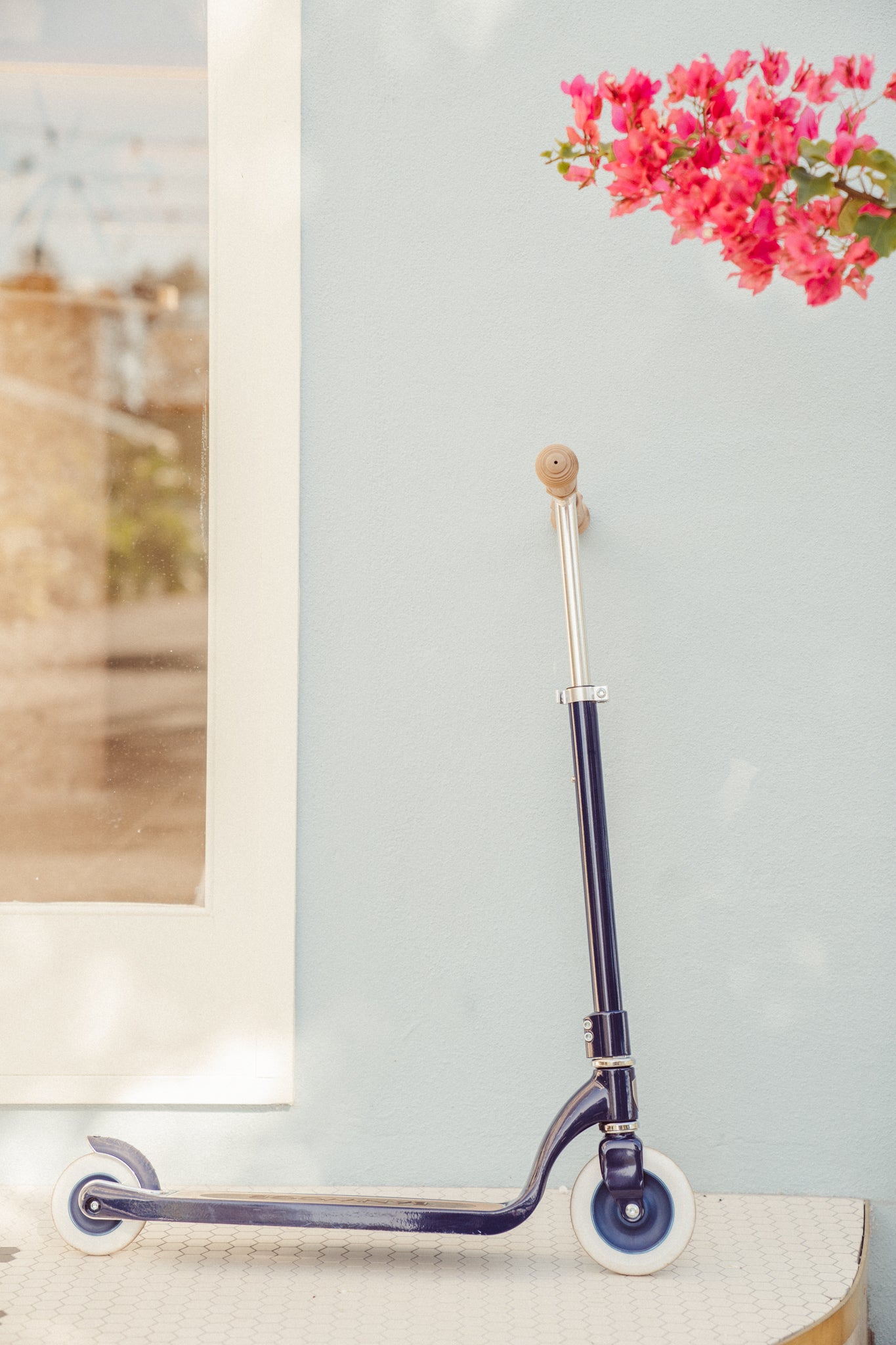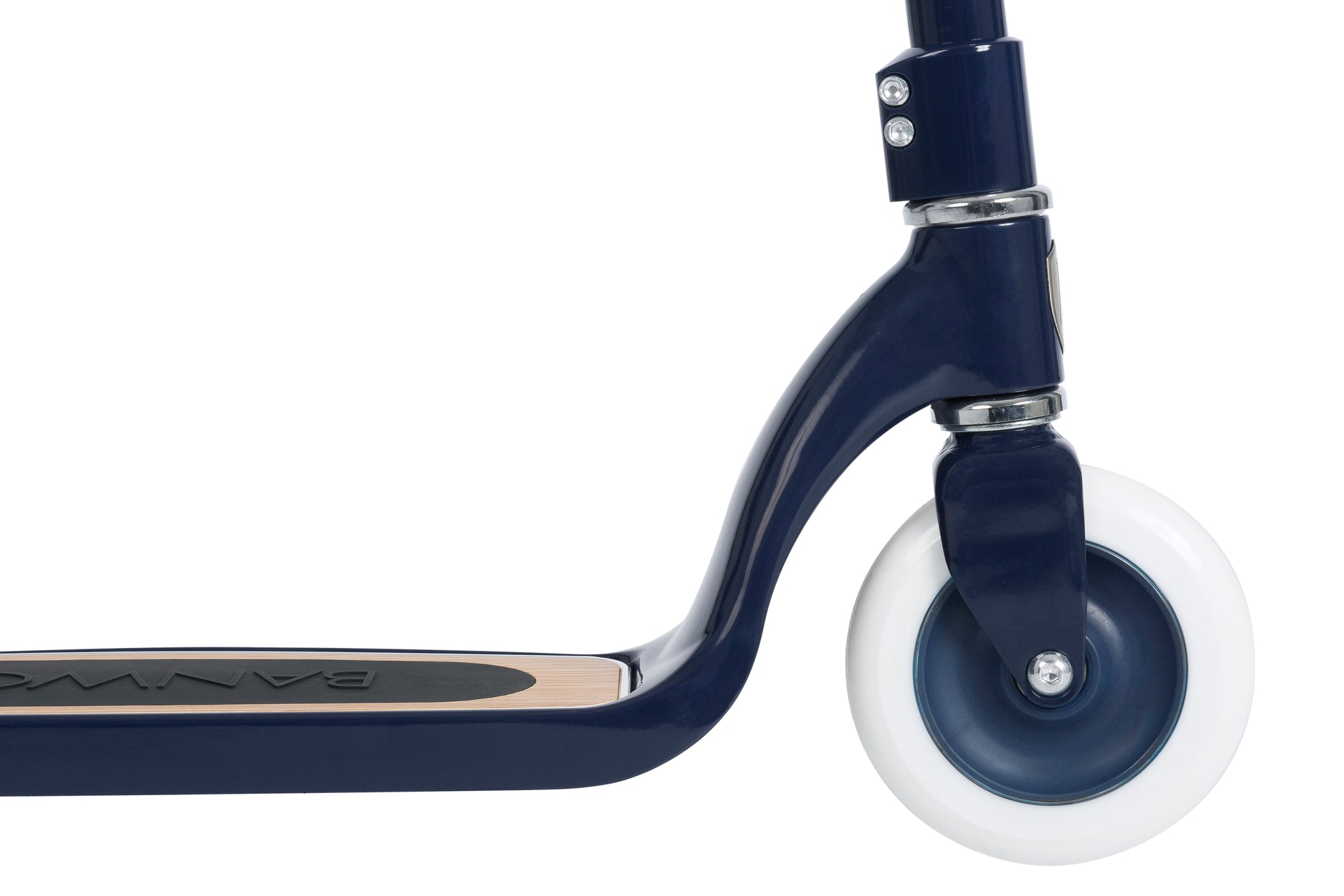 This navy two-wheel scooter is built to last the test of time and is equipped with an ergonomic T-handlebar that can easily be adjusted to your kid’s height, a lightweight aluminum frame, classic steering system – just like a bike, vintage-inspired rubber grips and a wooden oak anti-slip deck for a safe ride.