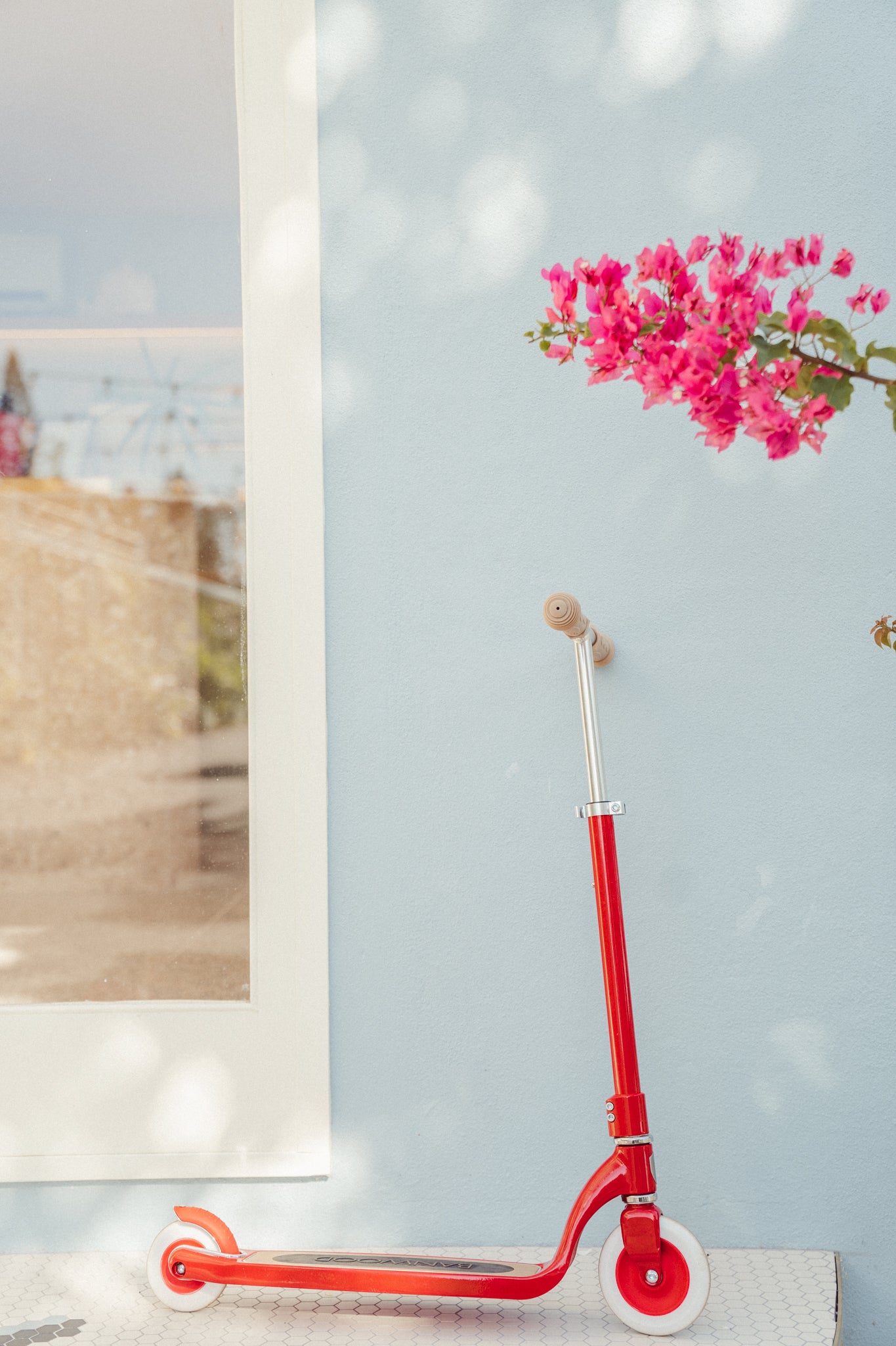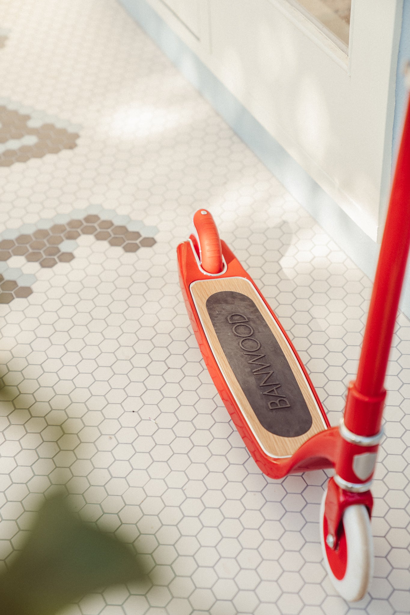 This red two-wheel scooter is built to last the test of time and is equipped with an ergonomic T-handlebar that can easily be adjusted to your kid’s height, a lightweight aluminum frame, classic steering system – just like a bike, vintage-inspired rubber grips and a wooden oak anti-slip deck for a safe ride.
