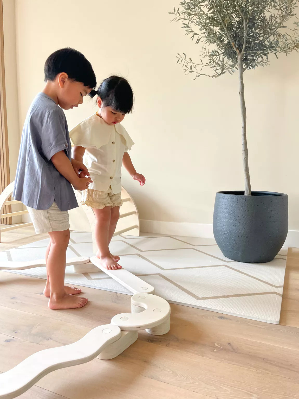 POLKU S is a perfect option for the youngest children who have already learned to walk and are ready to explore their balance and coordination skills. We recommend placing the beams on the ground without the connectors first and becoming familiar with the rail before moving higher off the ground.