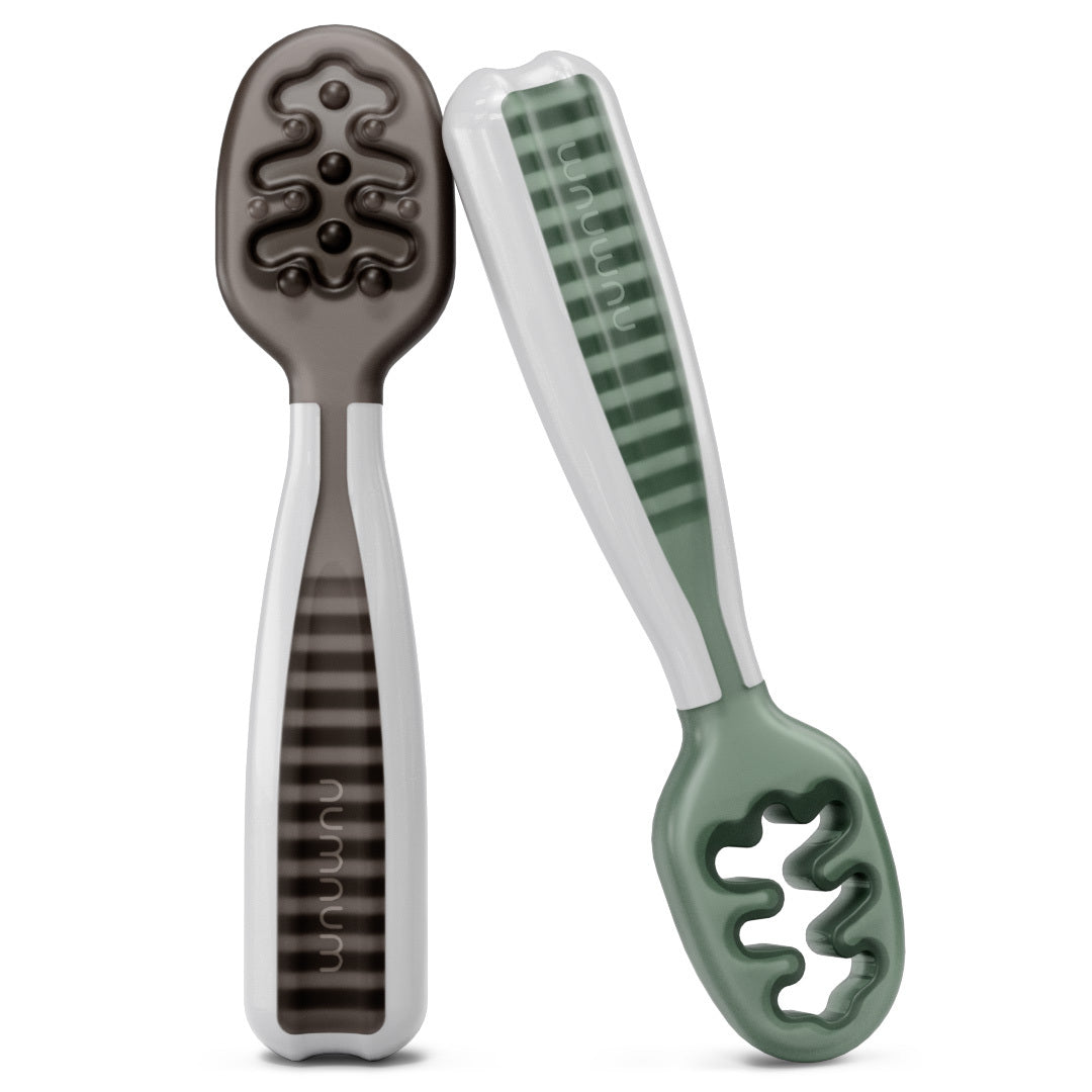 Sold in a dual-stage set, the NumNum GOOtensil™ is the revolutionary new first step to self-feeding. Its innovative flat design makes it easier to use than a spoon because there is no scooping, no balancing and no wrong way to hold it! The stage one GOOtensil™ has textures that grab just enough food to give a taste of self-feeding independence. Those textures also feel great on sore gums! For kids who have mastered the food-to-mouth motion, the stage two GOOtensil™ is perfect for thicker blends and pre-loading with solids. Before long, your little learner will begin making a scooping motion, an indication he or she is ready to graduate to the spoon. NumNum, indeed!