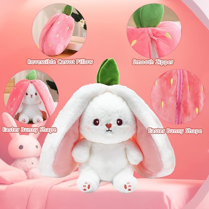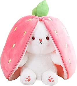 Unique and Clever Design: This plush toy cleverly transforms from a cozy strawberry or carrot pillow into a lovable bunny with long, floppy ears. Simply unzip the smooth zipper to reveal the hidden surprise—a cuddly rabbit that’s sure to delight anyone who sees it. With its adorable face and soft limbs, this plush companion is both charming and practical.