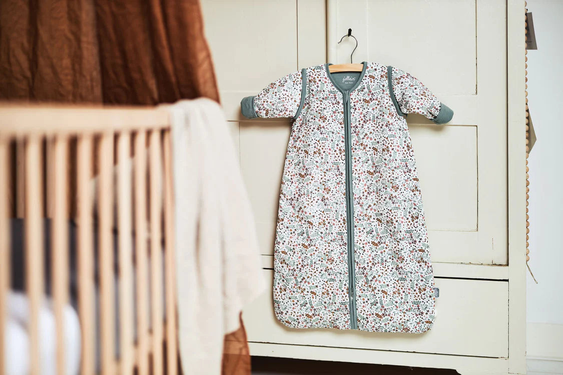 This sleeping bag looks like a romantic flower garden with the all-over flower print in pink, green and caramel, lined with green fillet. Would you like the sleeping bag with sleeves or without sleeves? For this romantic sleeping bag it doesn't matter. It's just which best suits the temperature in the baby bedroom and how warm your child is. In the winter, you use this flowers sleeping bag with sleeves and during the autumn or spring, when it is a bit warmer? Then you can zip off the sleeves. Very easily.