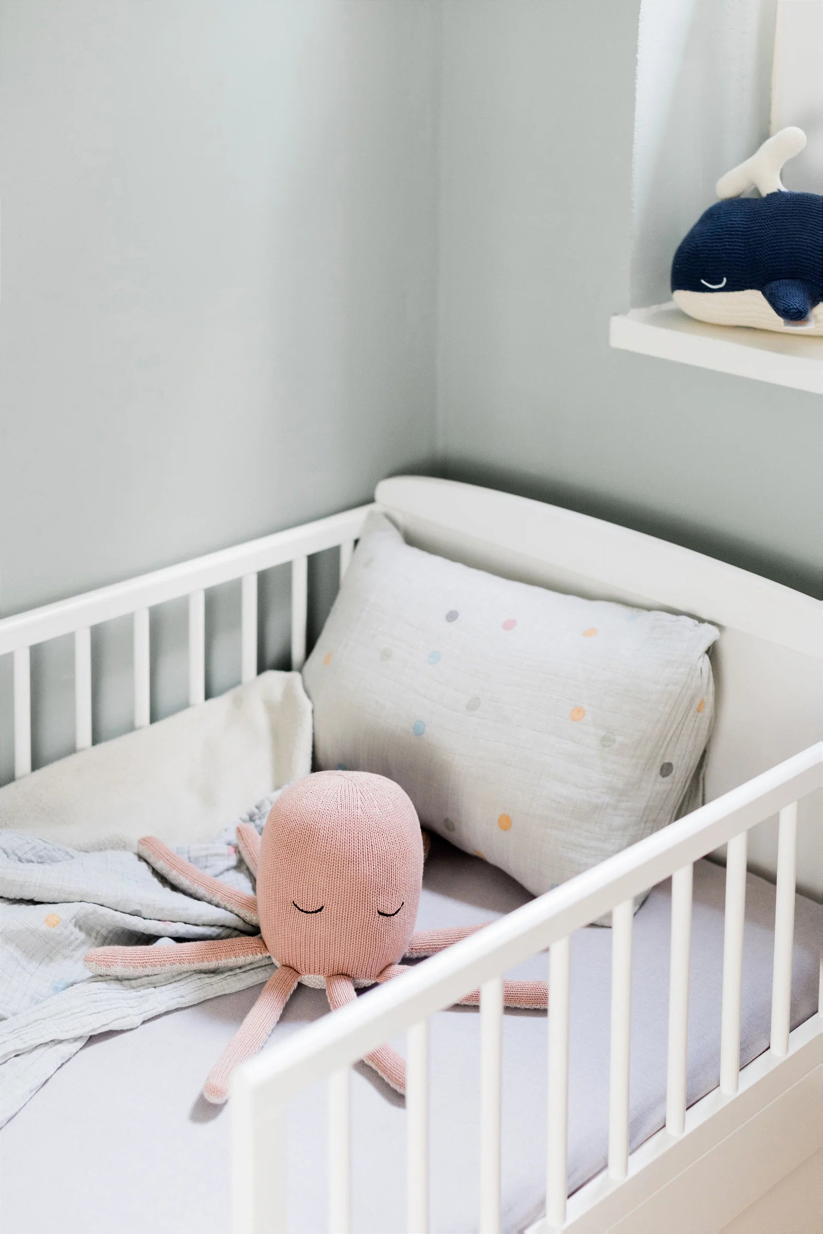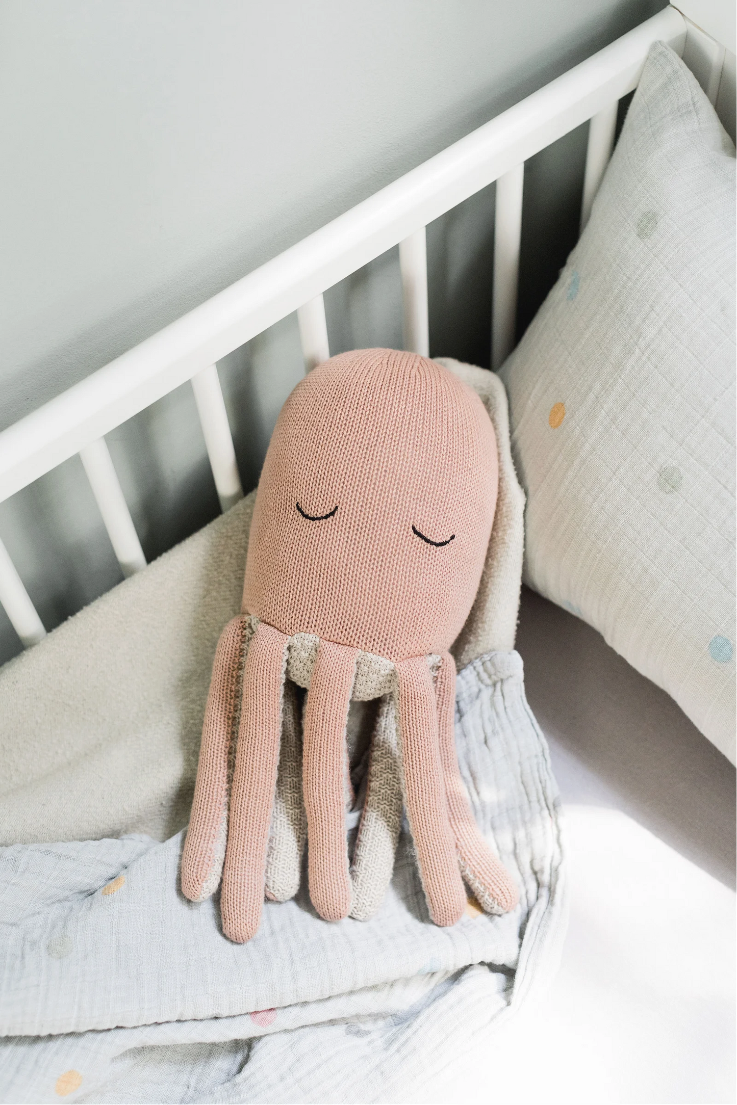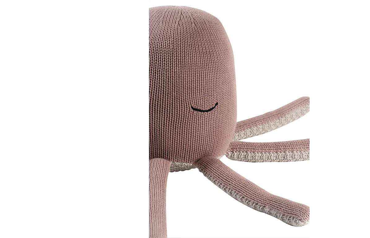 Speaking of tentacles: octopus cuddly toys are often used in preemie wards or recommended to parents of premature babies as the first cuddly toy. The tentacles remind babies of the umbilical cord, which they could feel and grasp in the womb. This creates a familiar environment. But thanks to its size, the octopus is not only an ideal cuddly toy for the very youngest, but also for older children - and can thus become the best friend for the whole childhood. Thanks to the subtle color combination of gray and dusky pink, the cotton octopus fits perfectly into a modern living environment and is suitable for both girls and boys.