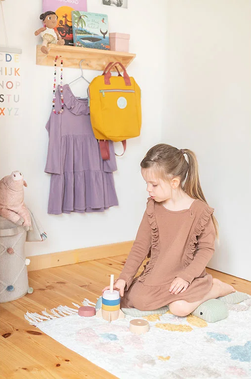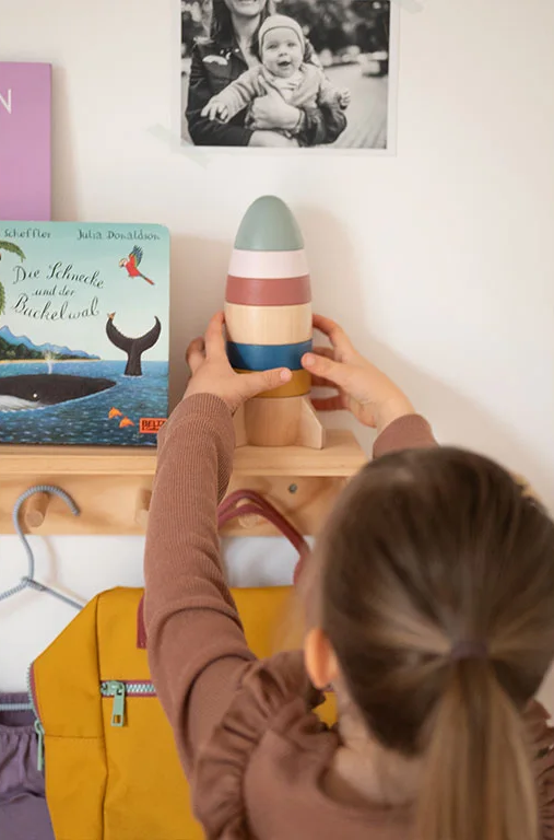 The stacking tower rocket from Kindsgutoffers galactic fun for your child. A stacking tower is one of the absolute classics that no child's room should be without. The pedagogical learning toy promotes fine motor skills and can be used in many ways. The child-friendly wooden rings in subtle unisex colors are easy to grab and stack, sort or creatively integrate into other play situations. The natural, light wood feels nice in your child's hands. Depending on the developmental stage of your child, the stacking tower is suitable from the age of 18 months. Your little one can then slowly start stacking the rings on the tower and will surely enjoy the great rocket motif. Thanks to the reduced unisex design and the high-quality workmanship, the stacking tower rocket fits perfectly into modern children's rooms. The rocket makes eyes sparkle when it is personalized with the child's name. This is possible on request. And best of all: for every stacking tower rocket sold, they donate 1€ to klische*esc. The non-profit association is committed to a more equal world in a variety of ways, which starts in the children's room.