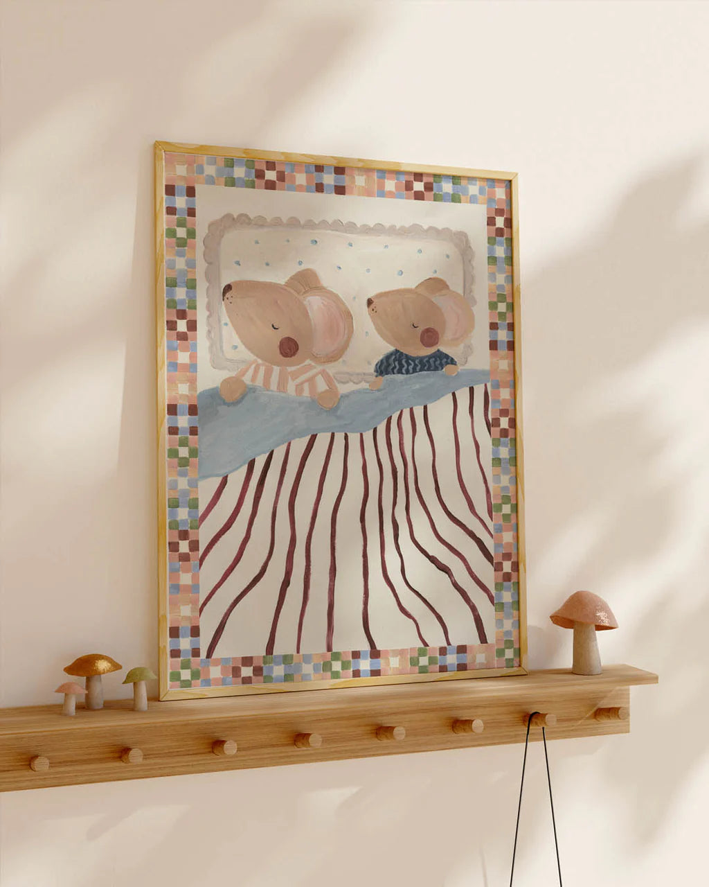 A whimsical hand-painted print featuring two sweet mice peacefully asleep under cosy blankets. Surrounded by a charming pastel checkerboard border, this nursery or bedroom wall art adds warmth and wonder to any child’s room. Part of our Sibling Love series, created in soft acrylics.