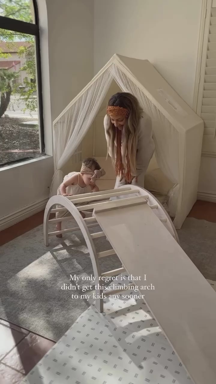 The TUOHI slide ramp is a fun and versatile product that can be combined with our GALDHØP climbing arch and with all the different wall bars in our range. The slide ramp has two sides, one for sliding and the other for climbing. It allows the well-known climbing arch and wall bars to take on new dimensions and thus takes the fun of playing to a whole new level. TUOHI is easy to use and does not require fixed installation. The inclination of the slide/climbing ramp can be changed in an instant by placing it on the desired pole.