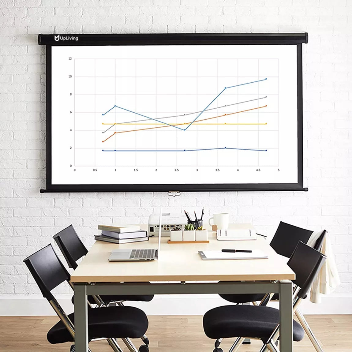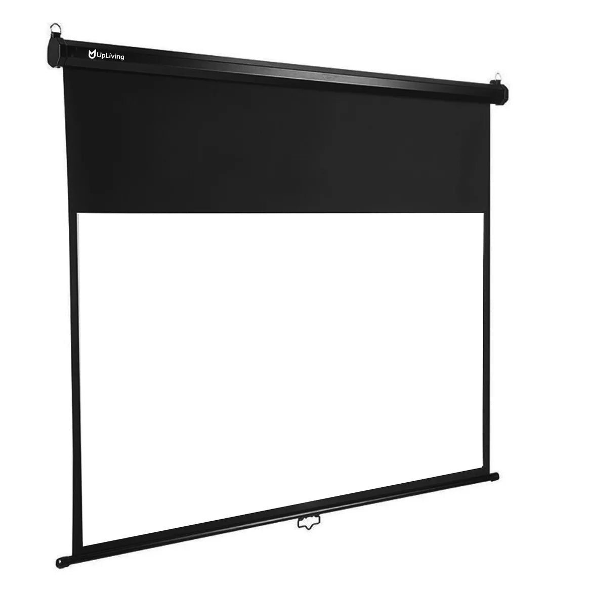UpLiving's durable metal projection screen can be mounted on the wall, in a corner, on the ceiling or in the ceiling. It pulls down and back up again easily. Perfect for home, office or movie nights.