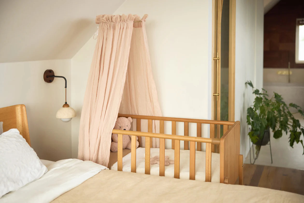 A net makes the cot a cosy place to sleep. And you will see: as soon as you have hung the veil, the baby's room is complete. It creates atmosphere and security. With the matching support you can easily hang a crib veil without having to drill holes in the ceiling or in the wall. The support with ring also ensures that the net immediately hangs properly.