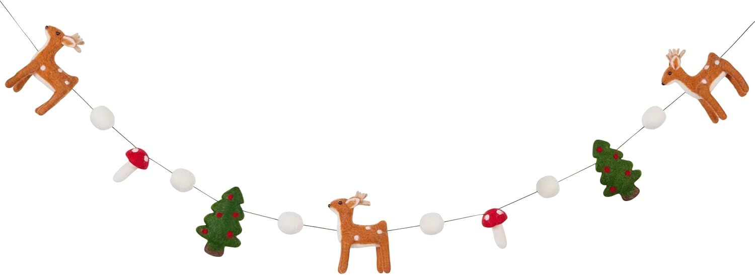 Dimensions – The garland measures a total length of 1.75 m, with pompoms measuring 3 cm in diameter, mushrooms at 4 cm in height, reindeer at 9 cm, and trees at 7 cm.