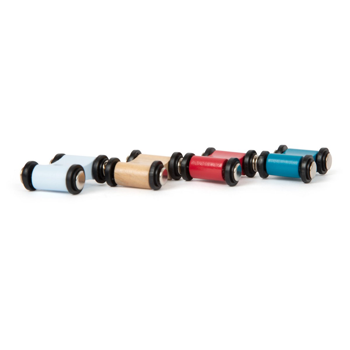 This click-clack wooden racetrack with a stable base promises fast-paced action when the four small wooden cars whiz down the ramps.